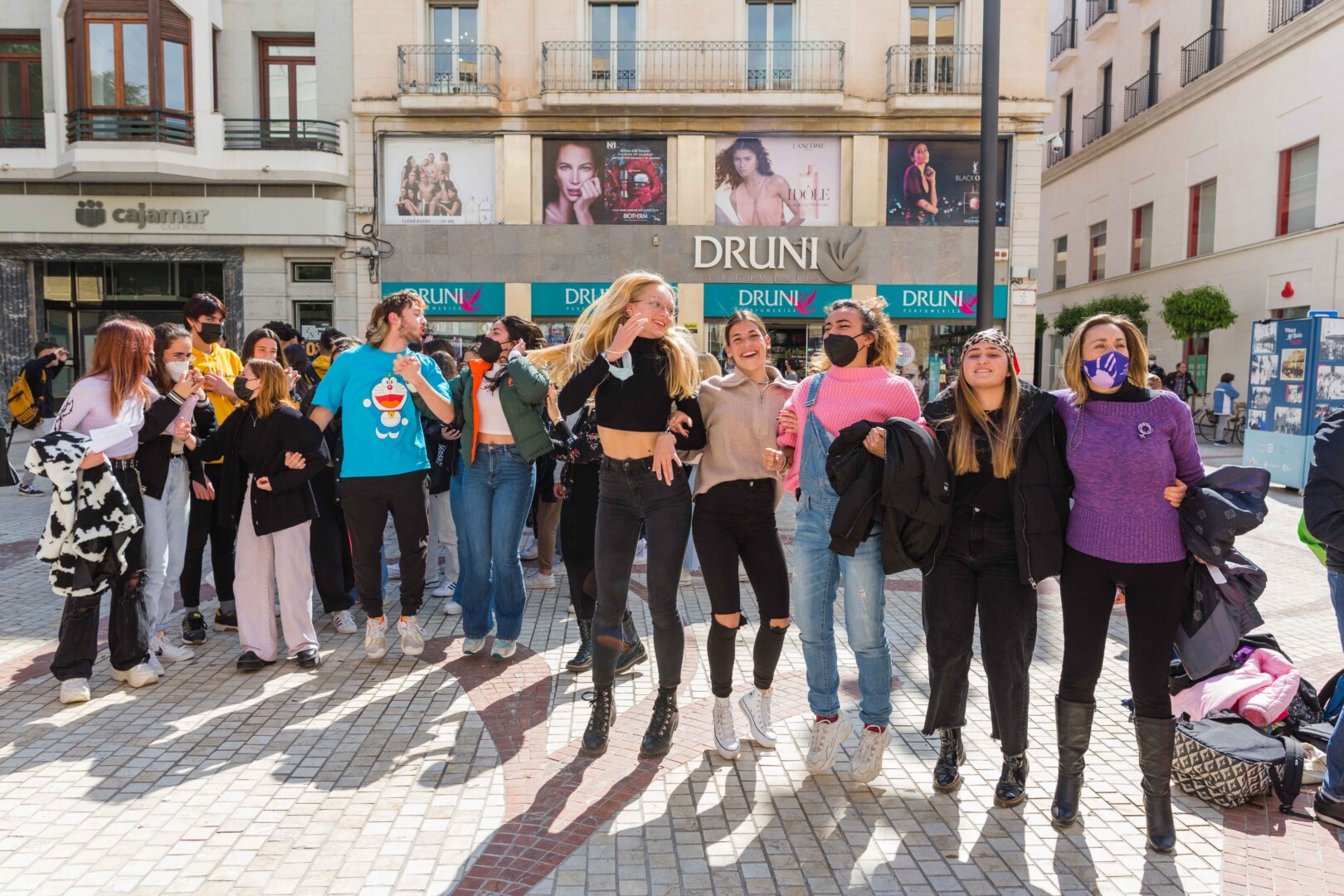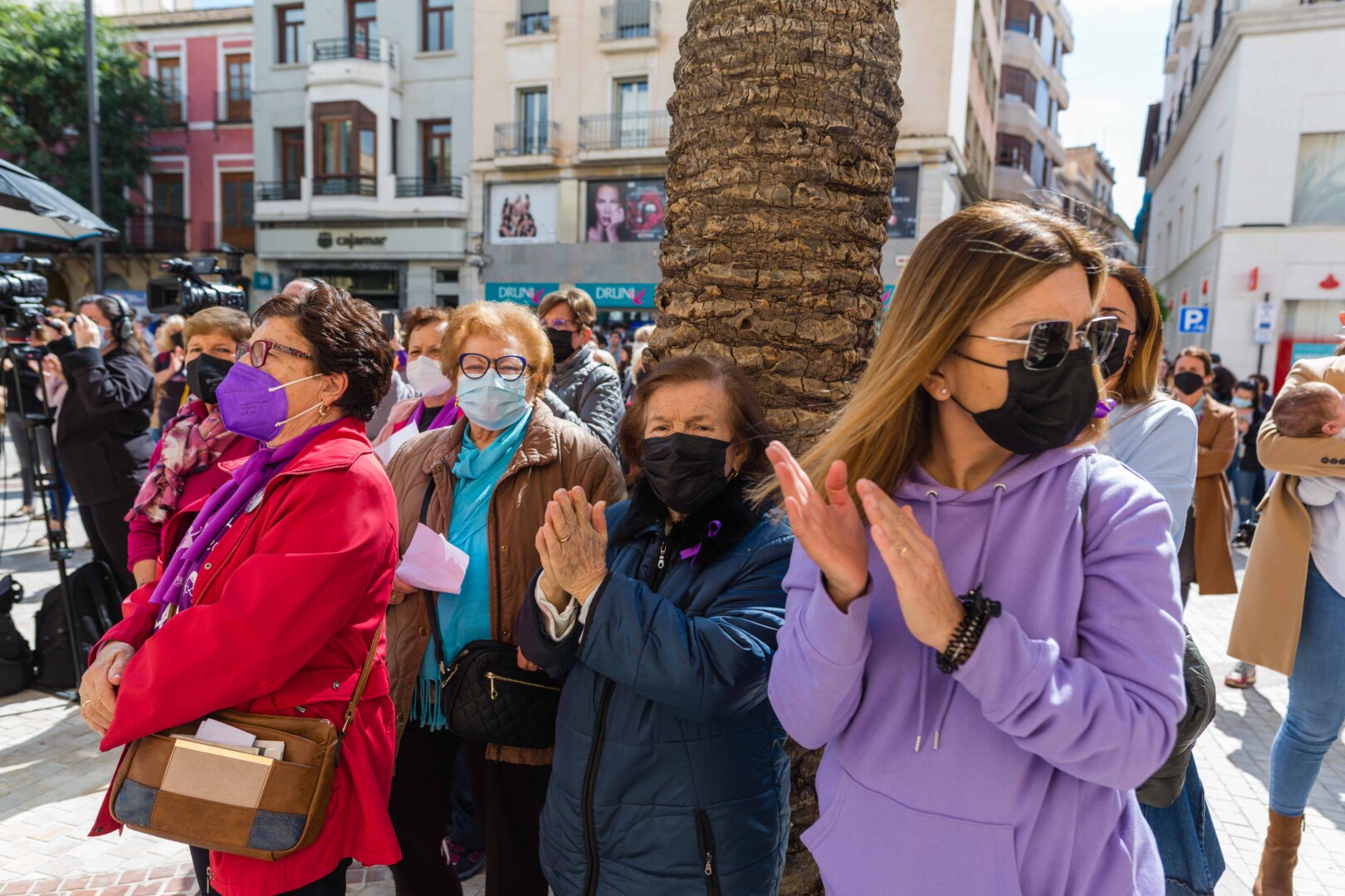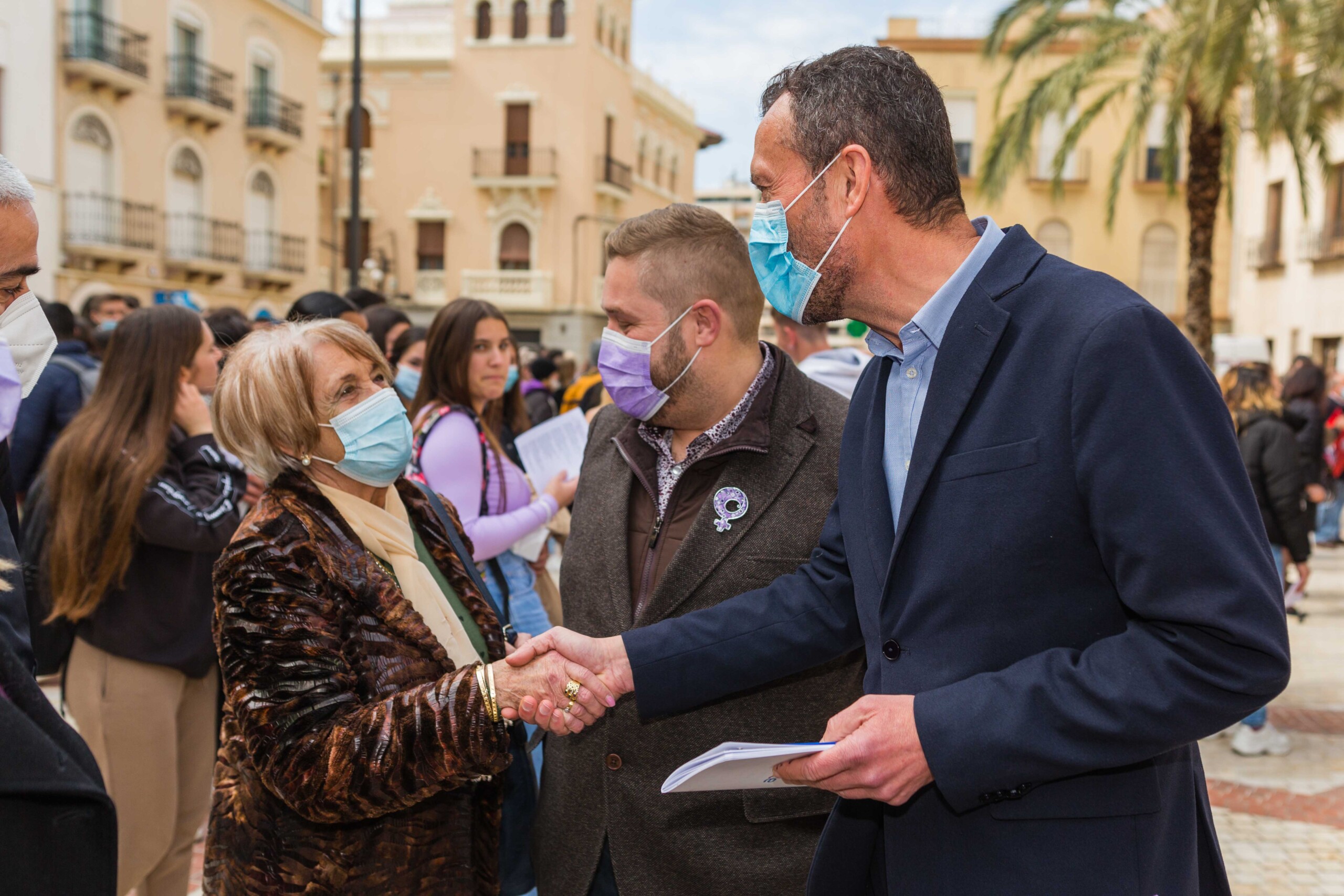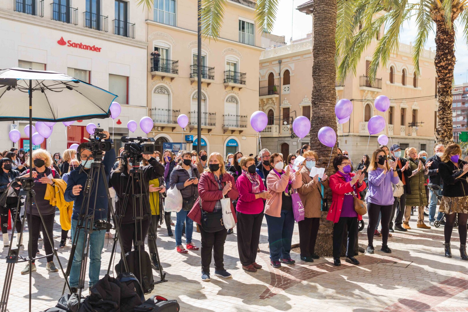Elche vuelve a teñirse de morado. Tras el parón de la pandemia, el Ayuntamiento ha inaugurado esta mañana los actos conmemorativos del Día Internacional de la Mujer con la lectura del manifiesto institucional de la Federación Valenciana de Municipios y Provincias (FVMP) personalizado para Elche y la interpretación por estudiantes del IES Montserrat Roig de la canción ‘Hay algo en mí’, un homenaje por la lucha de todas las mujeres a lo largo de historia. El encuentro ha tenido lugar en la Plaça de Baix con la presencia de más de un centenar de personas y en él ha participado el alcalde de Elche, Carlos González, el concejal de Igualdad, Mariano Valera y miembros del Equipo de Gobierno, así como de la Corporación Municipal.