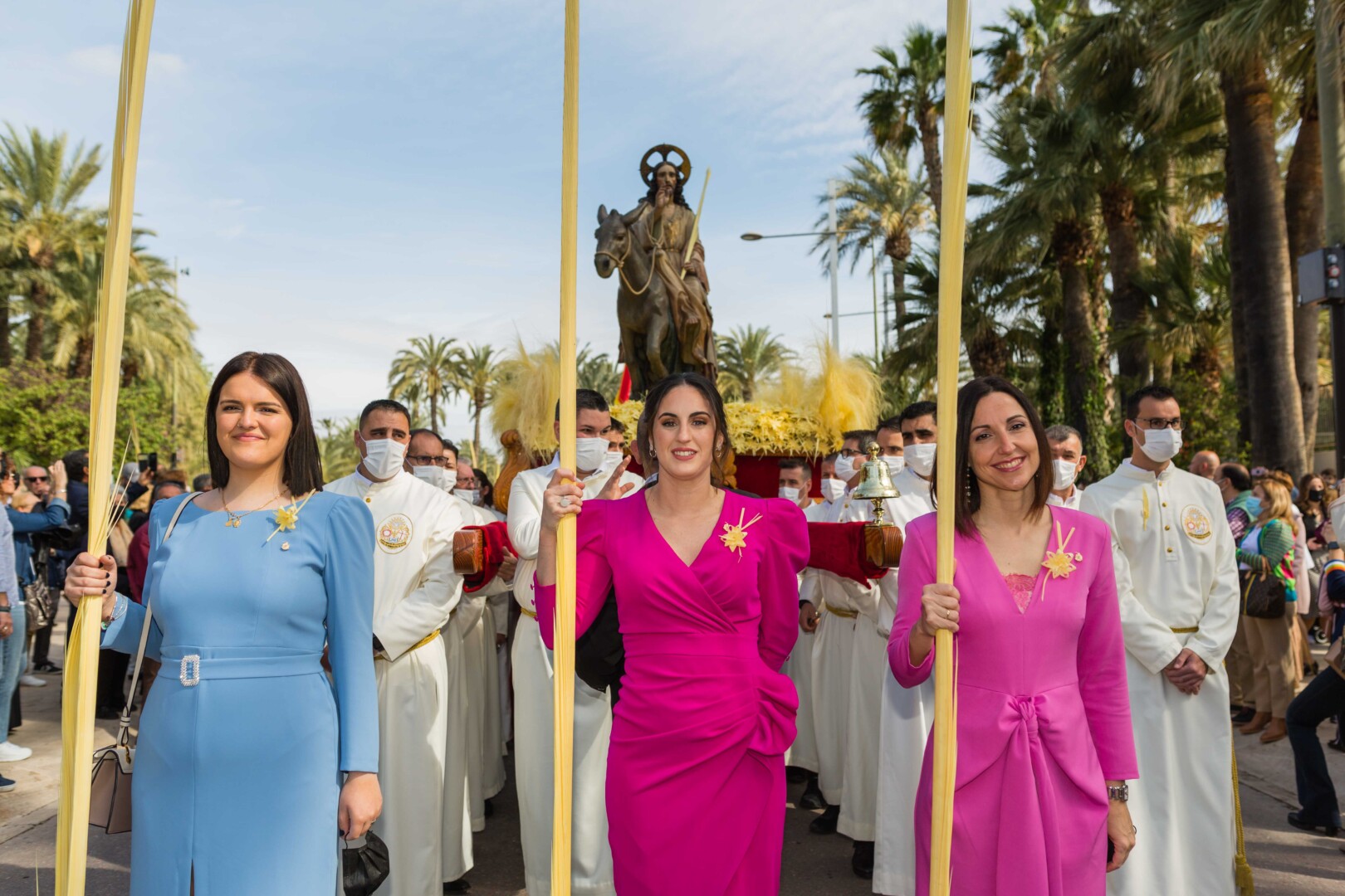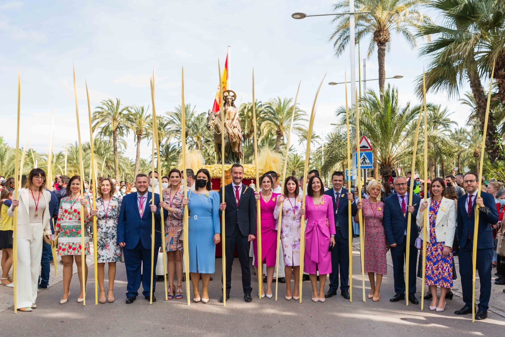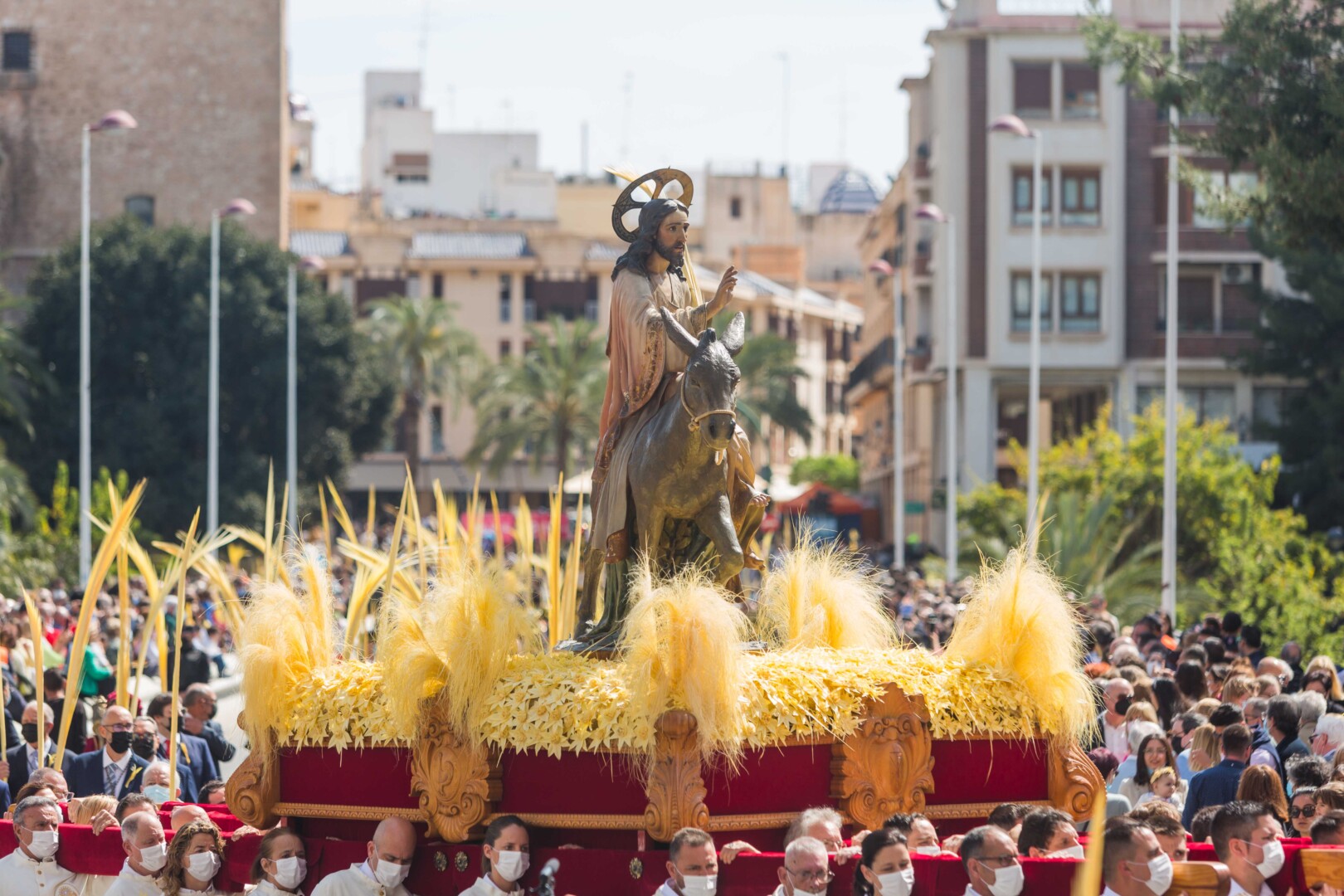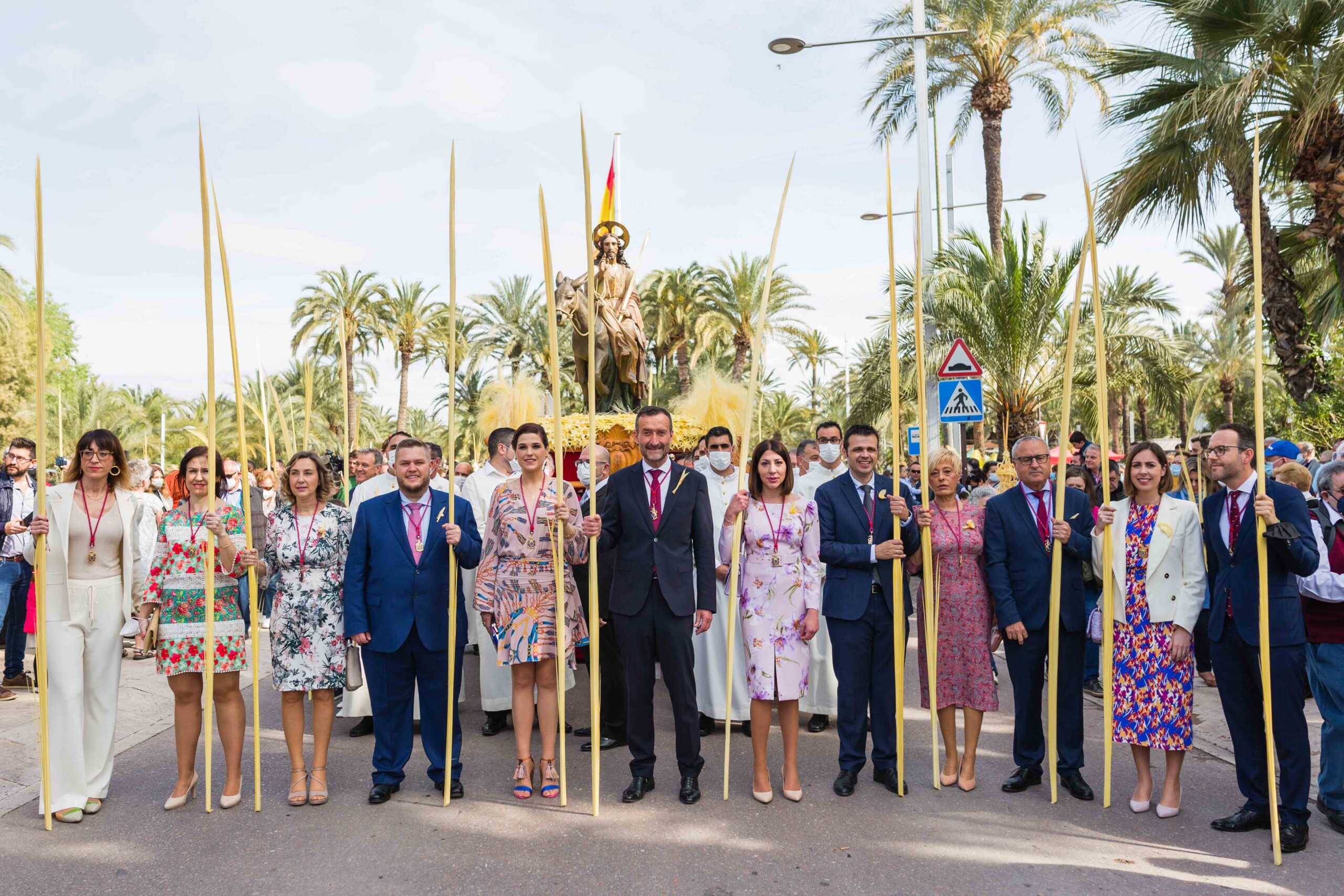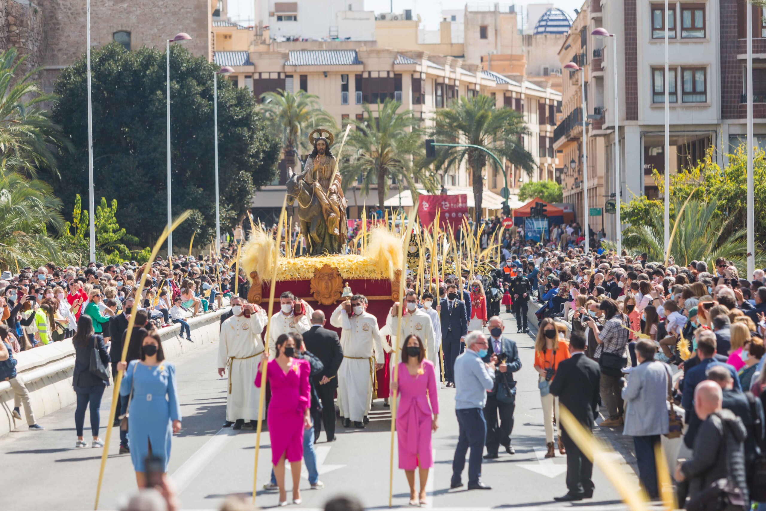La Semana Santa ha vuelto a Elche tras dos años con un multitudinario Domingo de Ramos. La Procesión de Jesús Triunfante, Fiesta de Interés Turístico Internacional desde el 22 de julio de 1997, ha arrancado a las 11:00 horas en el Paseo de la Estación, congregando a unas 60.000 personas y pasando por algunos de los lugares más icónicos del centro de la ciudad en su recorrido hasta la basílica de Santa María. El alcalde, Carlos González, la edil de Fiestas, Mariola Galiana, el presidente de la Junta Mayor de Cofradías y Hermandades, Joaquín Martínez, miembros del Equipo de Gobierno y de la Corporación Municipal, así como otras autoridades, han acompañado al llamado “Pas de la Burreta” junto a miles de ilicitanos y visitantes.