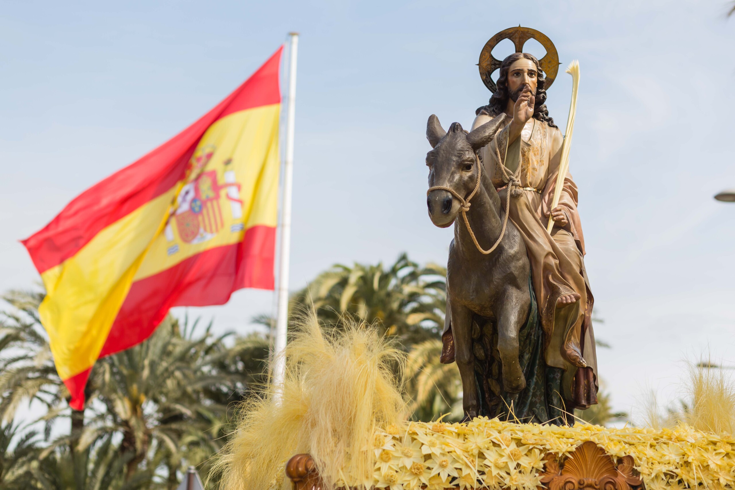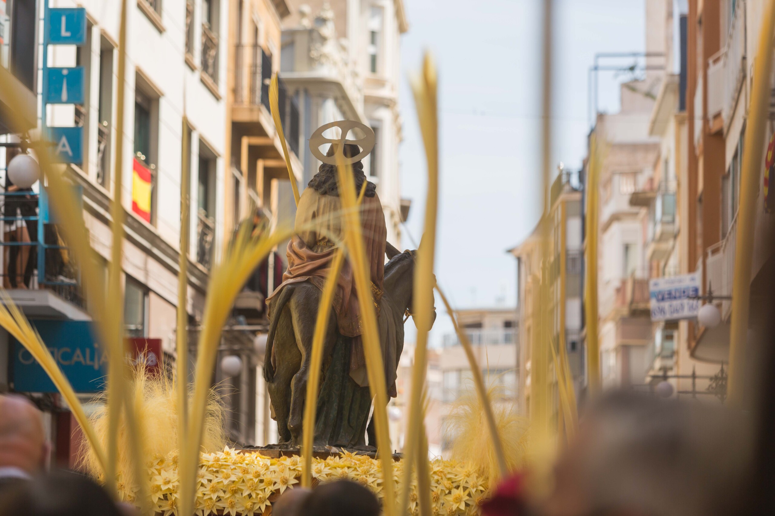 En este domingo se conmemora la entrada de Cristo en Jerusalén y marca el inicio de la Semana Santa, la Pasión, Muerte y Resurrección del Señor, que en el municipio presenta singularidades como el propio Pas de la Burreta, la Trencà del Guió o la Procesión de las Aleluyas. Esta última, que protagoniza el cartel de 2022 –obra del sevillano Antonio Díaz Arnido–, es cuando el cielo de Elche se teñirá de colores gracias a las populares estampas lanzadas por la ciudadanía desde sus balcones y ventanas como muestra de júbilo por la resurrección de Jesús y su reencuentro con la Virgen María.