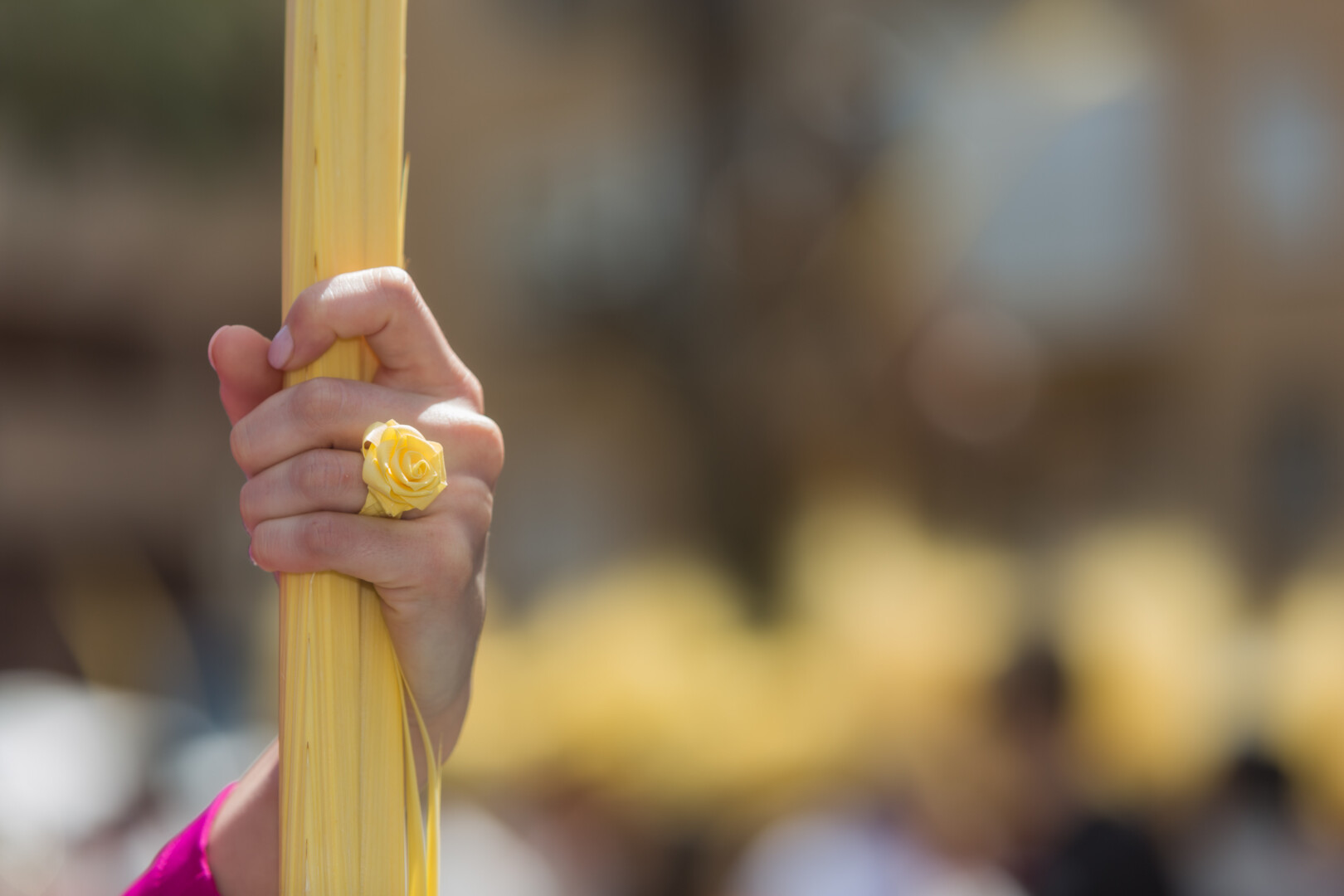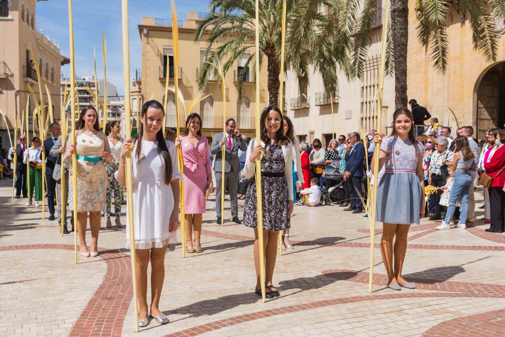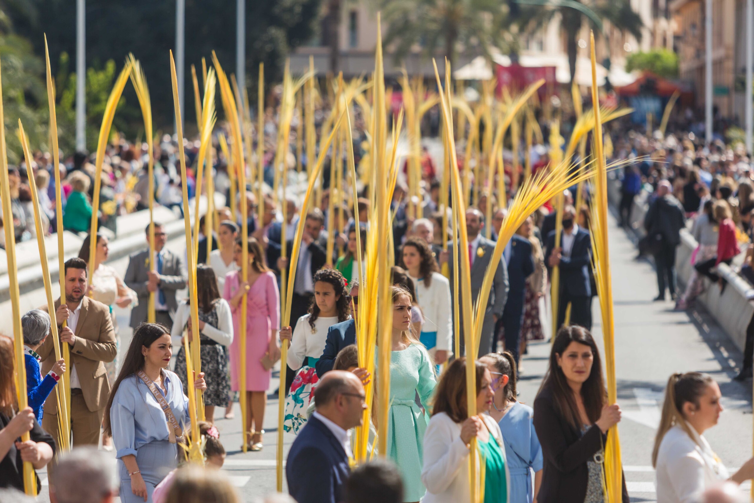 Palmas lisas y rizadas elaboradas artesanalmente por familias desde hace generaciones, con hojas de palmeras ilicitanas, han marchado por las calles en una procesión de la que se tiene constancia desde 1371, según un acta del Consejo Municipal de dicho año custodiada por el Archivo Histórico Municipal de Elche (AMHE), de los más importantes de la Comunidad Valenciana. El Domingo de Ramos está ligado al trenzado de la palma blanca, una técnica practicada en Elche desde hace siglos y con la que se confeccionan obras de arte como las vistas en el certamen de anoche en el Centro de Congresos –y que hoy encabezan la comitiva– o las enviadas como obsequio al papa, a los presidentes del Gobierno y de la Generalitat, al alcalde de Jaca y a los obispos de Orihuela-Alicante y de Solsona.