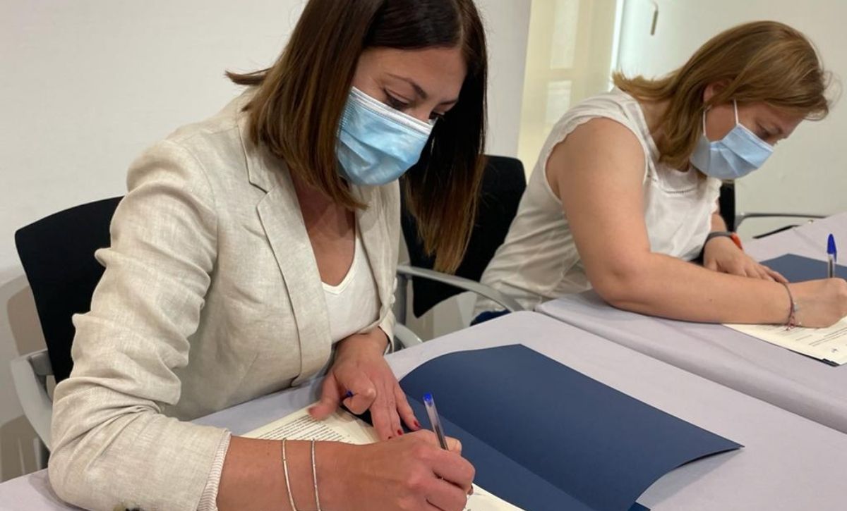 La concejala del área, Mariola Galiana, y la vicepresidenta de Medicus Mundi, Begoña Seguí, firman el convenio de colaboración que tiene como objetivo formar a profesionales y estudiantes de la salud en la cooperación al desarrollo