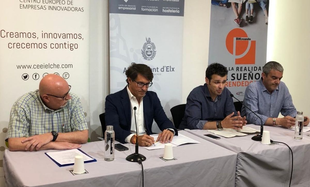 El edil de Promoción Económica, Carles Molina; el jefe de Gestión Administrativa de Salesianos Elche, Carlos Berenguer; el presidente del CEEI Elche, José Javier García Zamora; y el diputado de Innovación, Juan de Dios Navarro, presentan el evento, que será el jueves en el Centro de Congresos