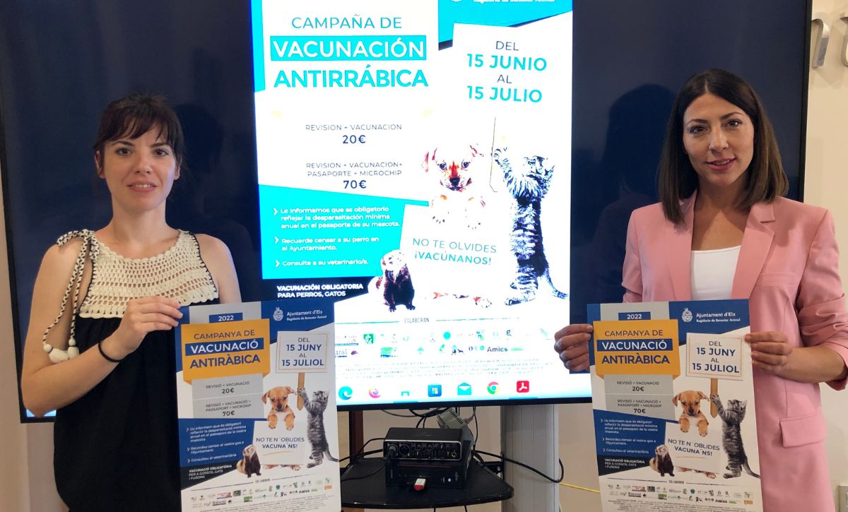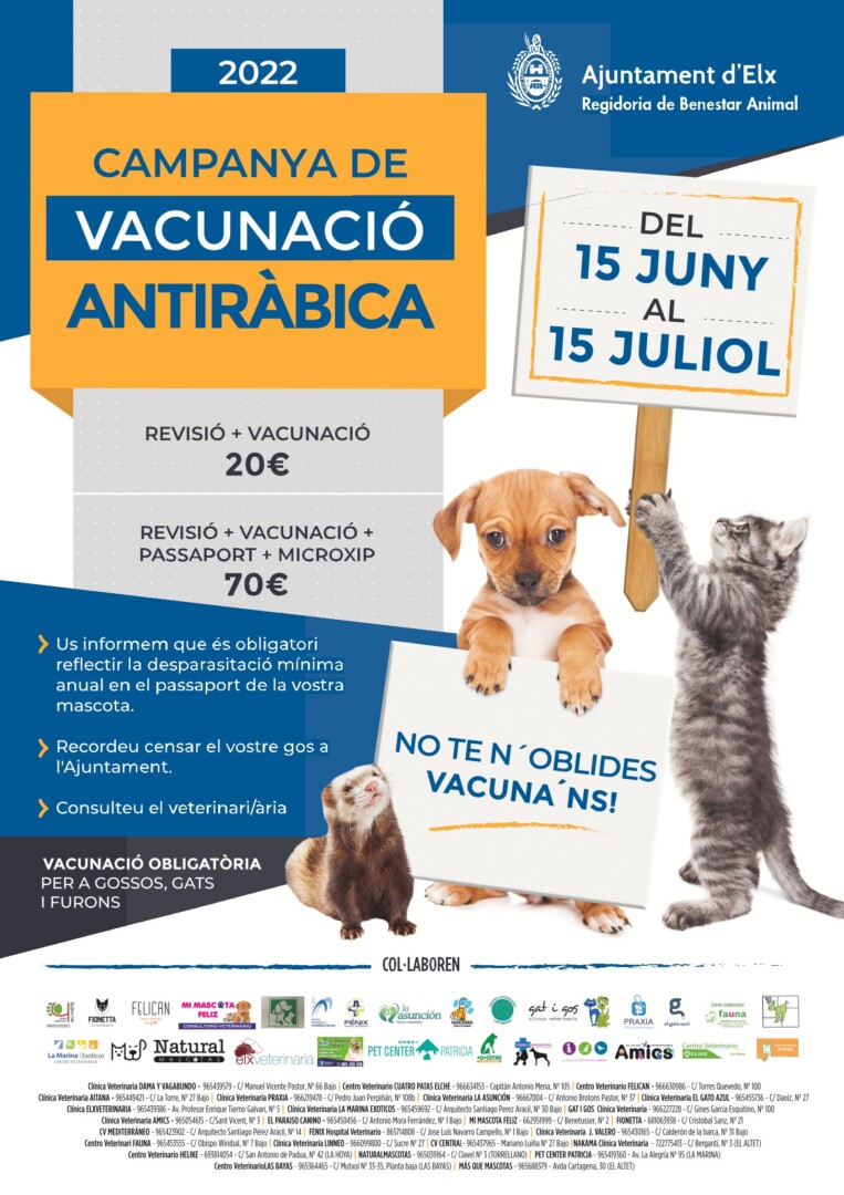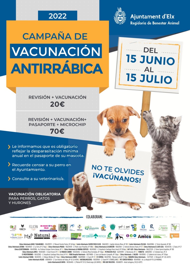 La campaña de vacunación antirrábica del Ayuntamiento de Elche cuenta para este año con la colaboración de 26 centros veterinarios repartidos por todo el municipio. Desde el miércoles 15 de junio al viernes 15 de julio, los propietarios de mascotas pueden inmunizarlas por 20 euros o 70 euros si incluye, además de la vacuna, la emisión del pasaporte e implantación del microchip. Unos precios que se mantienen respecto a 2021.