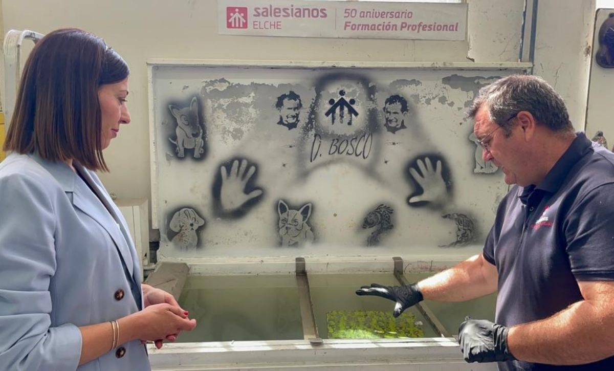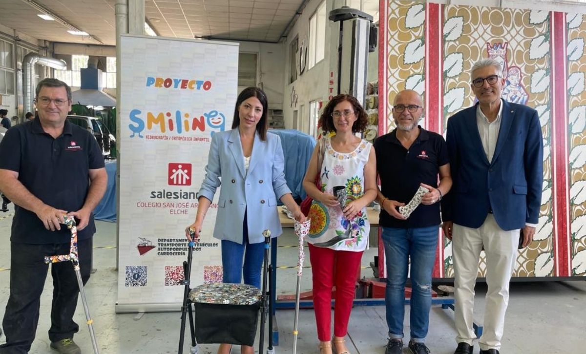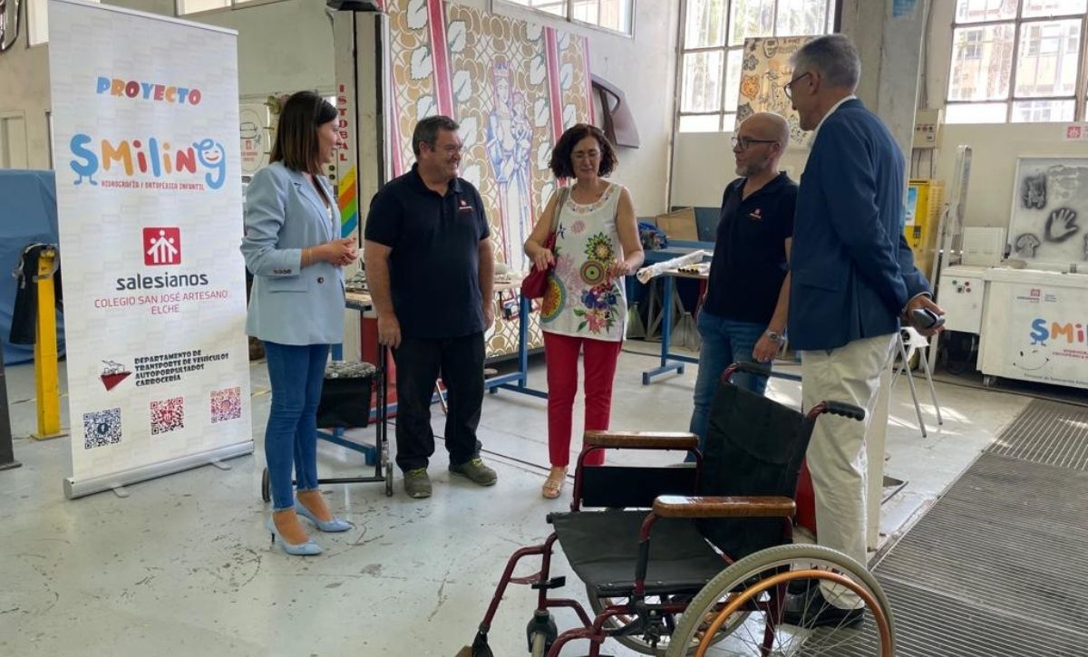 La concejalía de Sanidad del Ayuntamiento de Elche, en colaboración de la Conselleria de Sanidad y el Hospital General, ha impulsado, a través de una subvención de 3.000 euros, el proyecto Smiling. Una iniciativa solidaria, puesta en marcha por medio centenar de estudiantes de Primero y Segundo del ciclo formativo de carrocería del colegio Salesianos de Matola, que consiste en personalizar con personajes de ficción todos aquellos elementos ortopédicos infantiles y juveniles con la intención de arrancar una sonrisa y mejorar el bienestar emocional de jóvenes sin recursos, enfermos o con minusvalía. La edil del área, Mariola Galiana, ha visitado, junto al jefe del departamento de Mantenimiento de Vehículos, Pedro Sempere, y el profesor del ciclo de carrocería, Jesús Brazales, las instalaciones del centro educativo donde se imparten las clases para conocer de primera mano el proyecto.