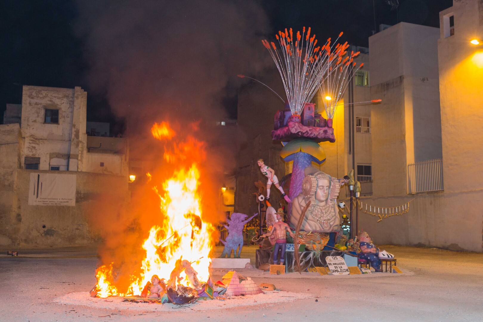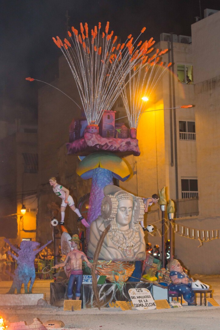 Las Hogueras Mayor e Infantil del barrio El Raval ardieron esta madrugada de forma espectacular ante la mirada emocionada de miles de vecinos y vecinas que no quisieron perderse el gran espectáculo del fuego tras dos años de pandemia. Sobre las 23:30 horas una enorme llama de gran altura comenzaba a consumir rápidamente y en su totalidad los monumentos del artista Andrés Europa Díaz, primero el de la hoguera infantil y posteriormente a medianoche la hoguera mayor, situadas en el solar junto a la iglesia de San Juan. El alcalde, Carlos González, y la concejala de Fiestas, Mariola Galiana, presenciaron la cremà a ritmo de Aromas Ilicitanos acompañados por la chef ilicitana Susi Díaz, las reinas y damas de las Fiestas de Elche 2019 y miembros de la Federación Gestora de Festejos Populares, así como las reinas y damas del la Comisión de Fiestas El Raval y las reinas y damas de la Comisión de Fiestas Puertas Tahullas.