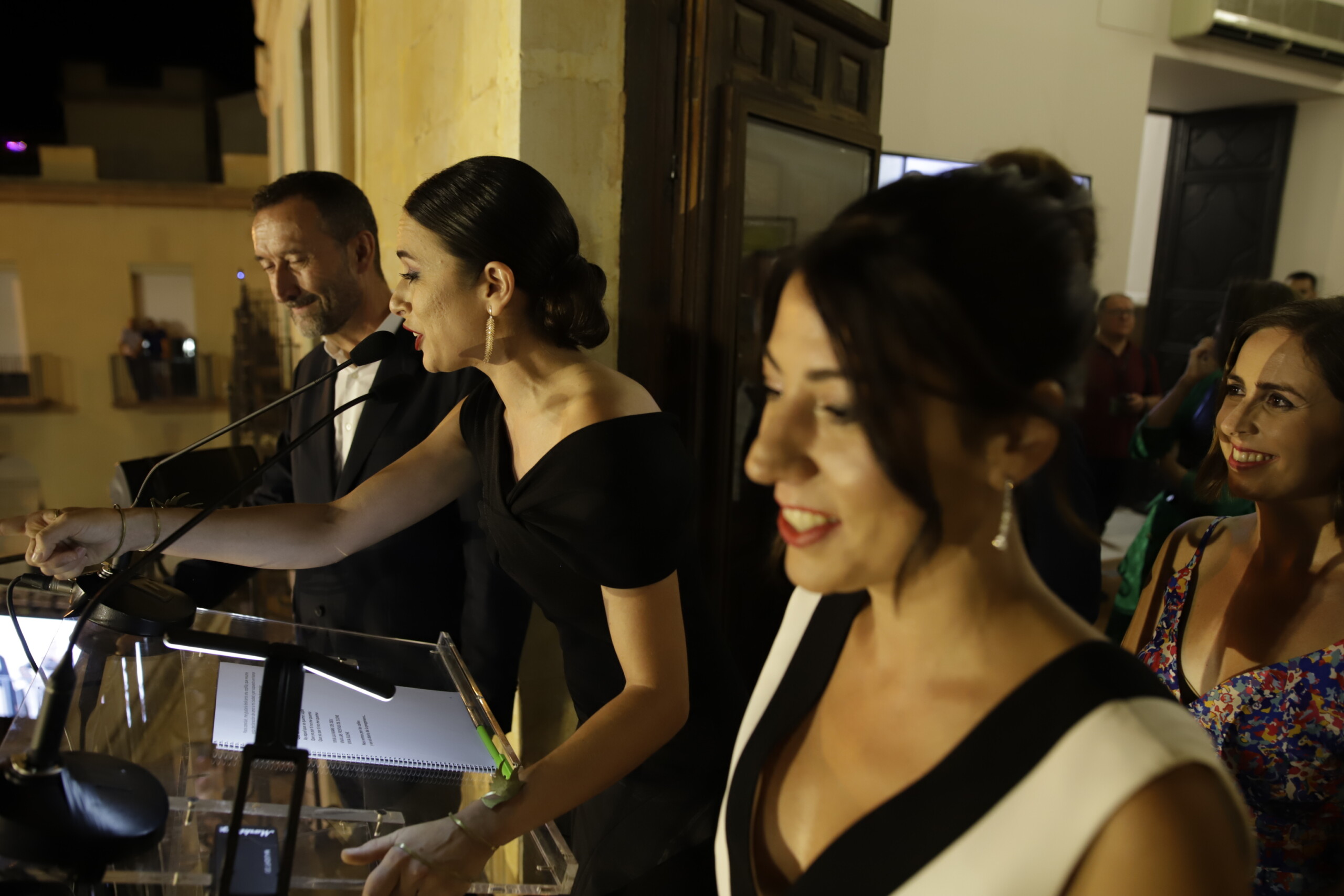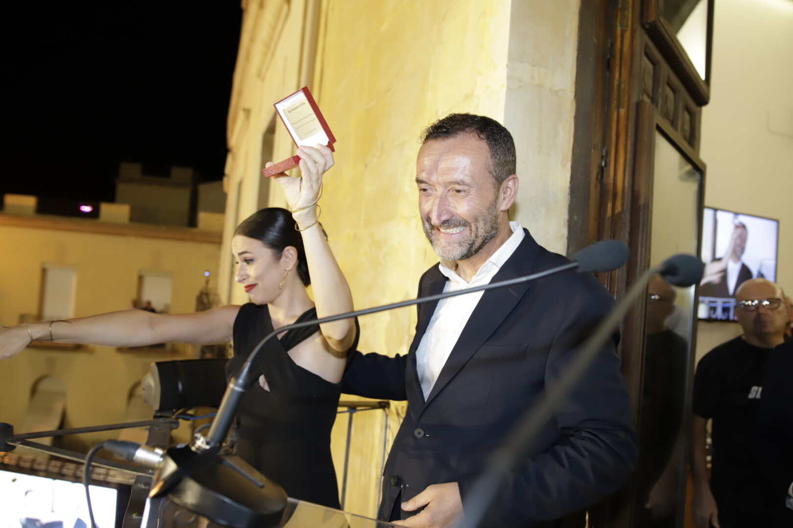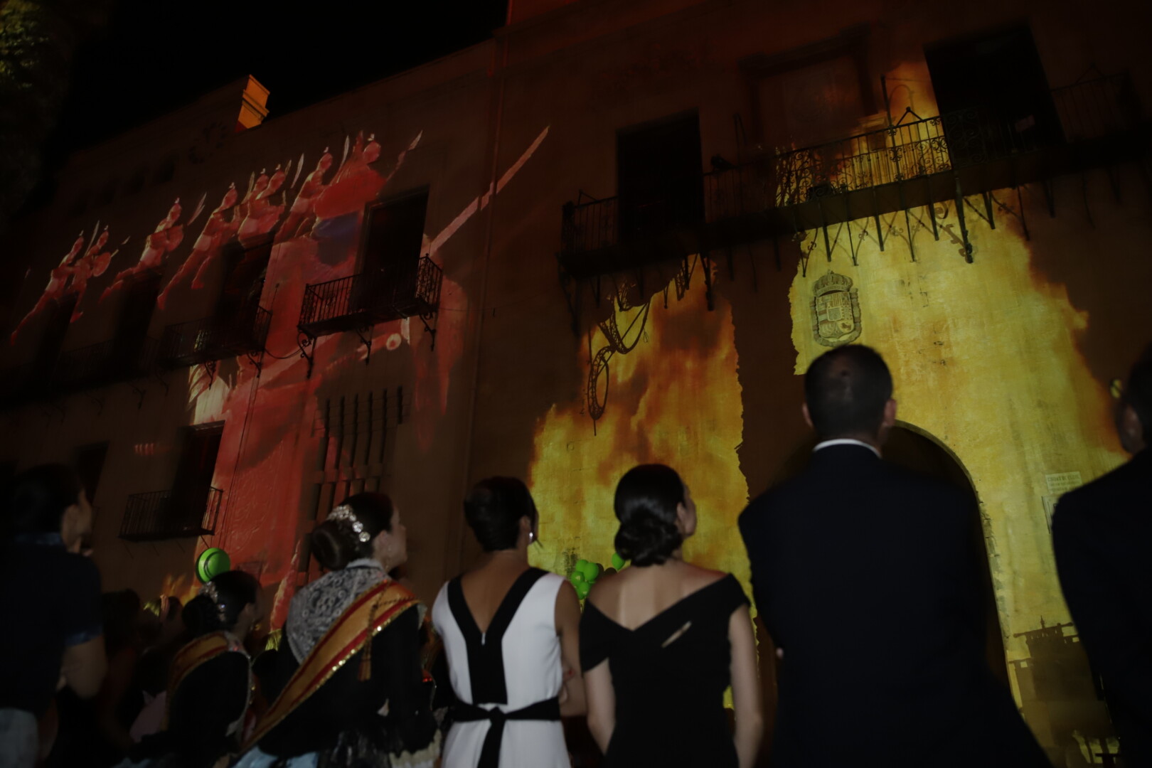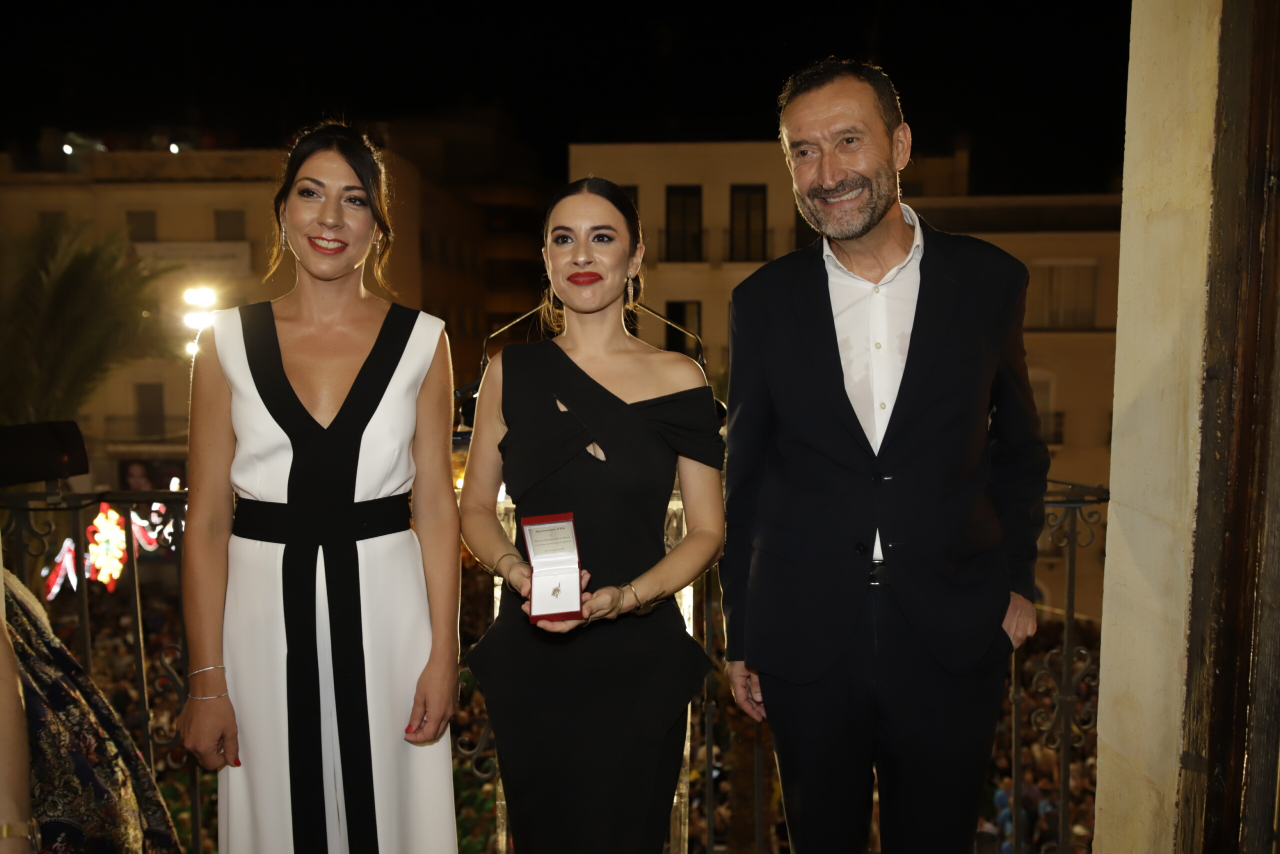La periodista Maje Amorós, quien ha conducido el evento, daba comienzo a la velada a las 22:00 horas. Aunque ha estado precedida por el encendido del alumbrado en la peatonalizada Plaça de Baix. Tras recibir el alcalde a los responsables de la Asociación Festera de Moros y Cristianos, de la Federación Gestora de Festejos Populares, de la Unió de Festers del Camp d’Elx, de Pobladores, del Centro Aragonés y de la Comunidad Andaluza, los cargos del presente ejercicio de dichas entidades también han salido al balcón del edificio consistorial para recibir los calurosos aplausos de sus paisanos.