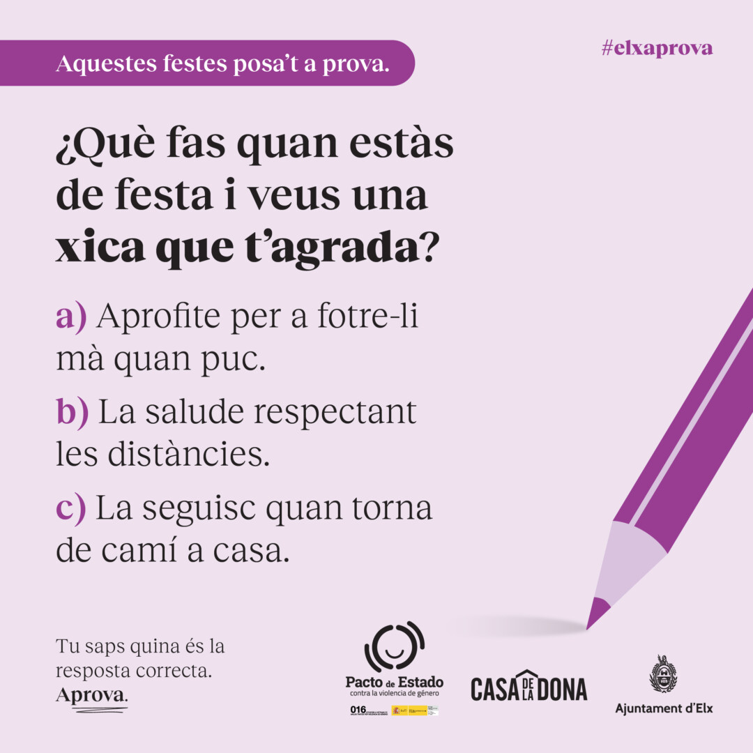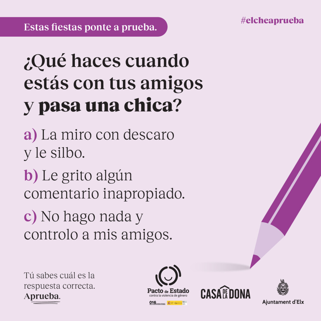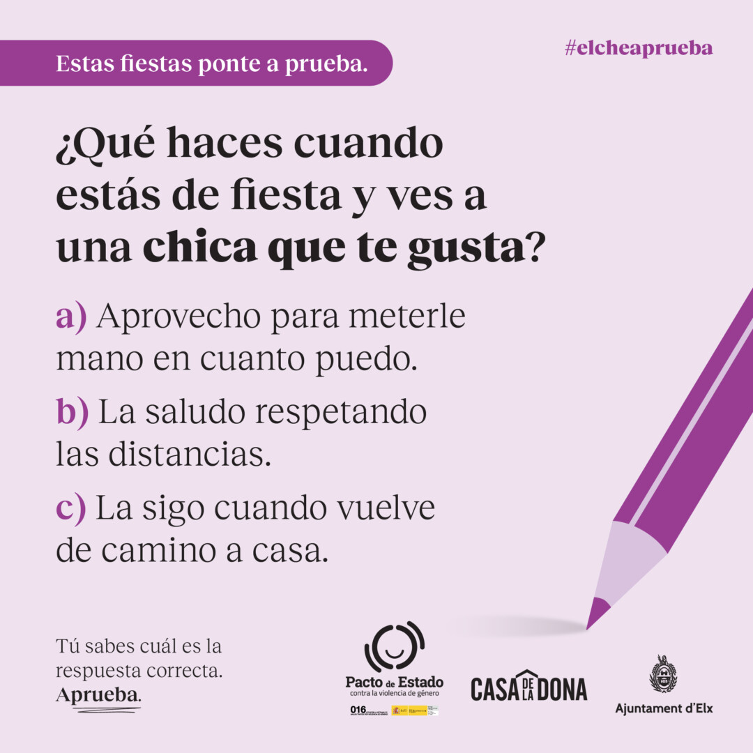 La Concejalía de Igualdad, con el objetivo de prevenir la violencia de género en las fiestas patronales, ha impulsado una campaña con el slogan «ElcheAprueba» dirigida a los hombres, especialmente jóvenes, y basada en preguntas tipo test sobre situaciones acoso y machismo que se producen estando de fiesta, tal y como ha explicado el edil del área, Mariano Valera.