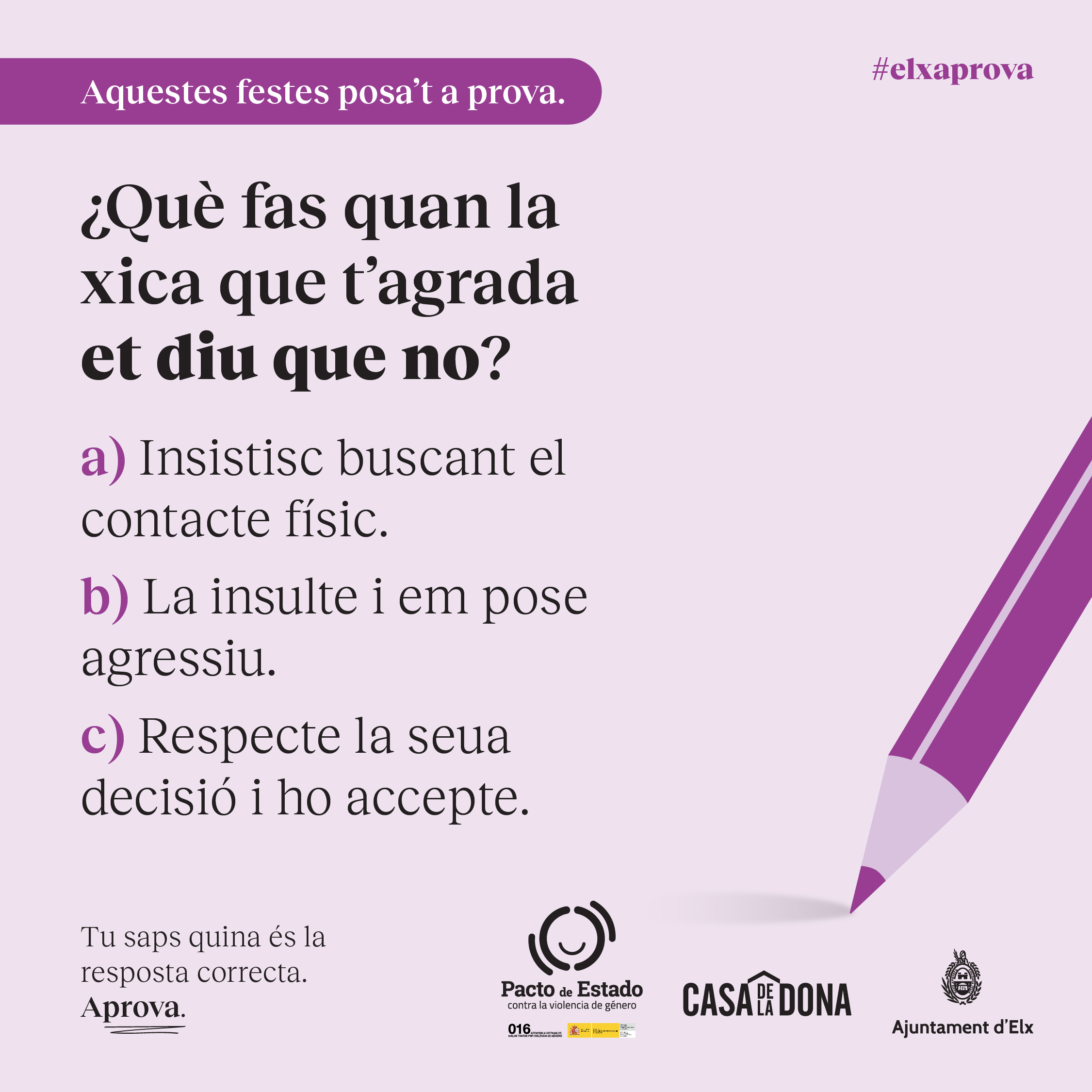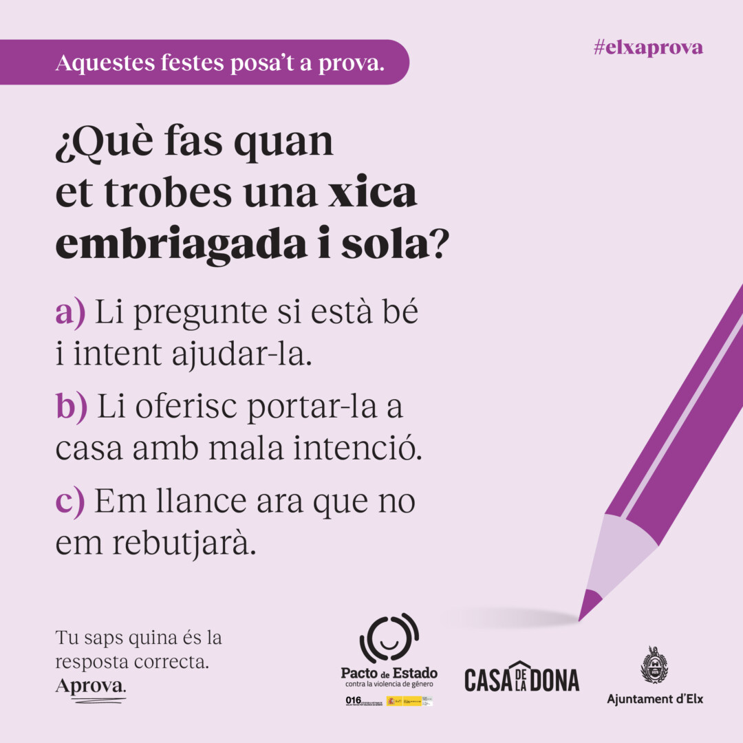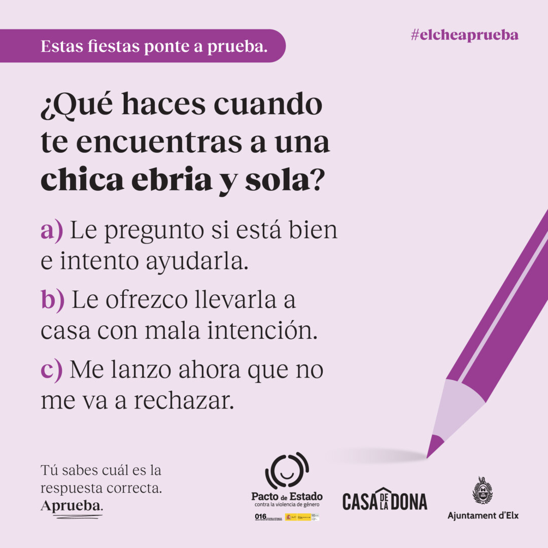 La Concejalía de Igualdad, con el objetivo de prevenir la violencia de género en las fiestas patronales, ha impulsado una campaña con el slogan «ElcheAprueba» dirigida a los hombres, especialmente jóvenes, y basada en preguntas tipo test sobre situaciones acoso y machismo que se producen estando de fiesta, tal y como ha explicado el edil del área, Mariano Valera.