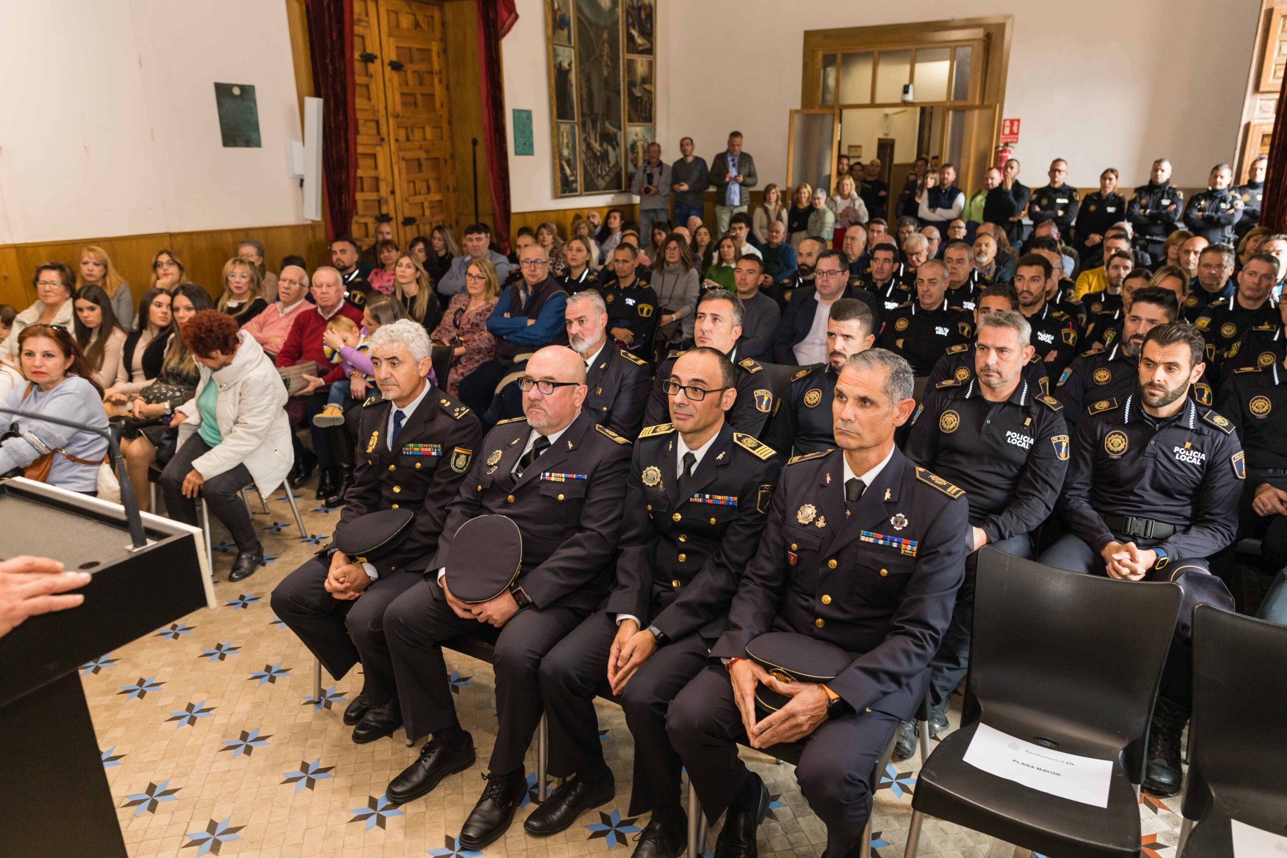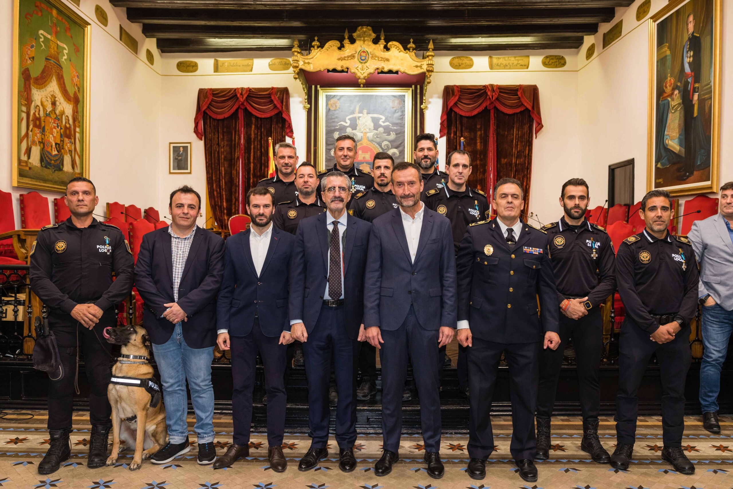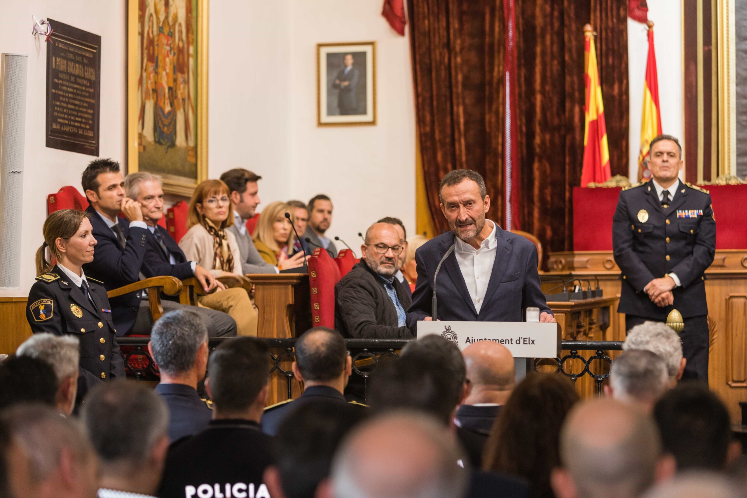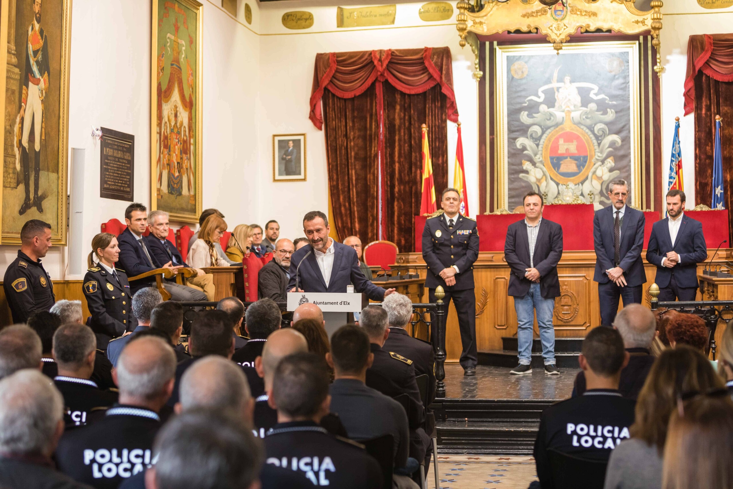 El alcalde, Carlos González, el secretario autonómico de Seguridad y Emergencias, José María Ángel Batalla, el edil de Seguridad Ciudadana, Ramón Abad, el jefe de la Policía Local de Elche, César Zaragoza, miembros del Equipo de Gobierno y de la Corporación Municipal participan en el acto celebrado esta mañana en el Salón de Plenos