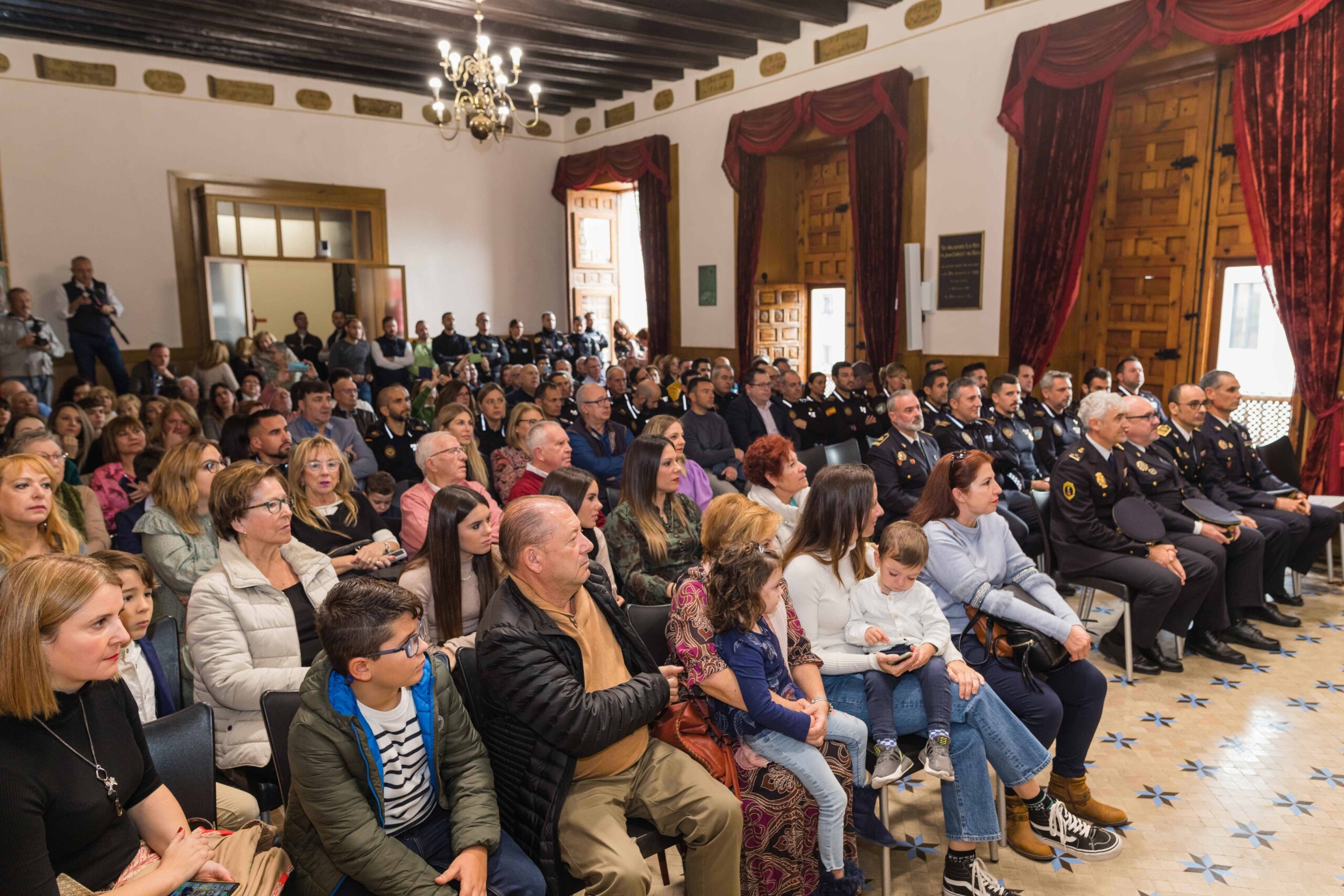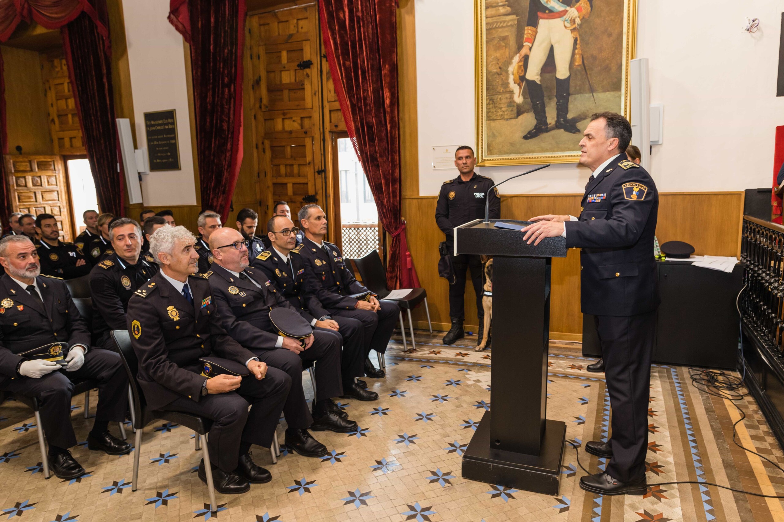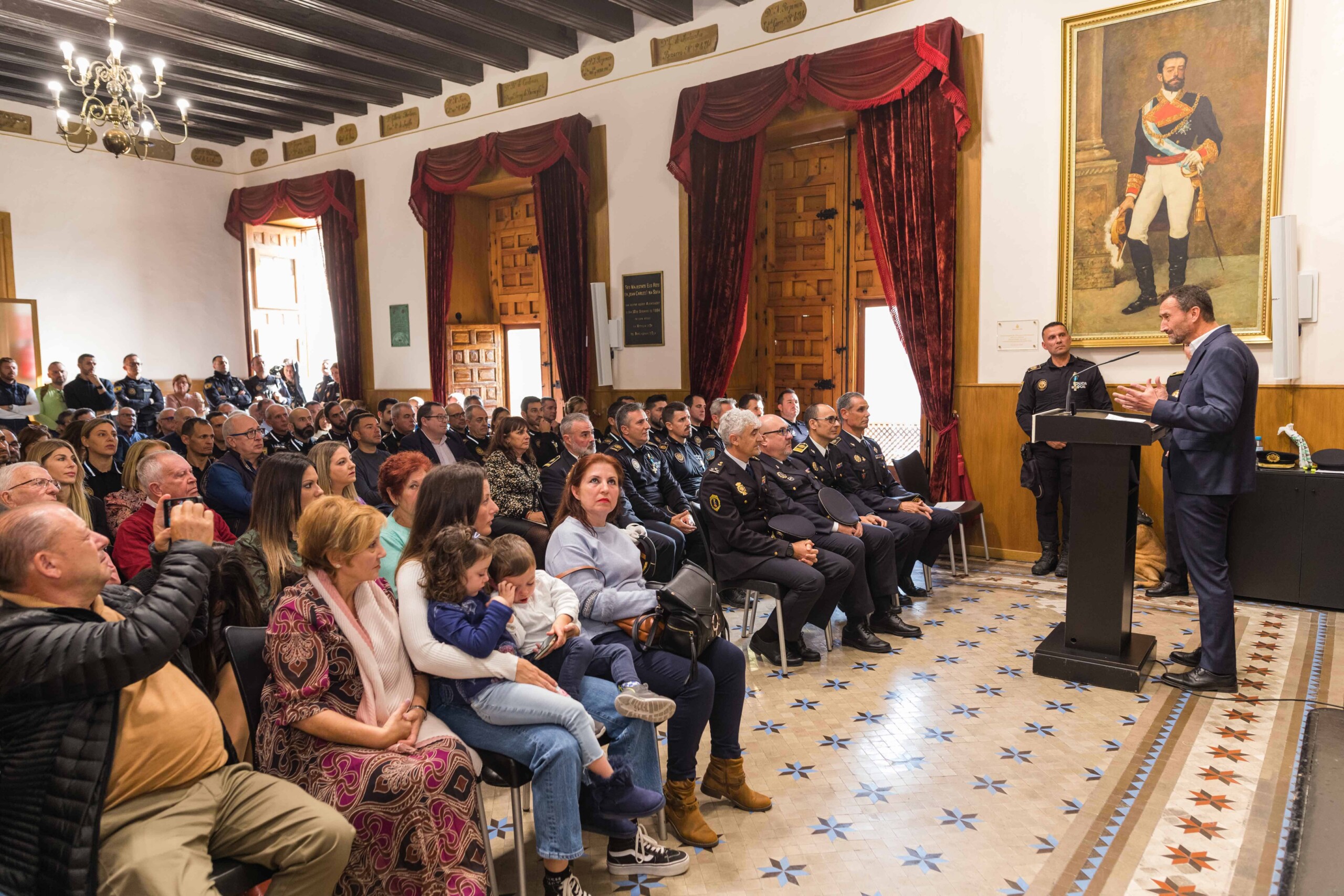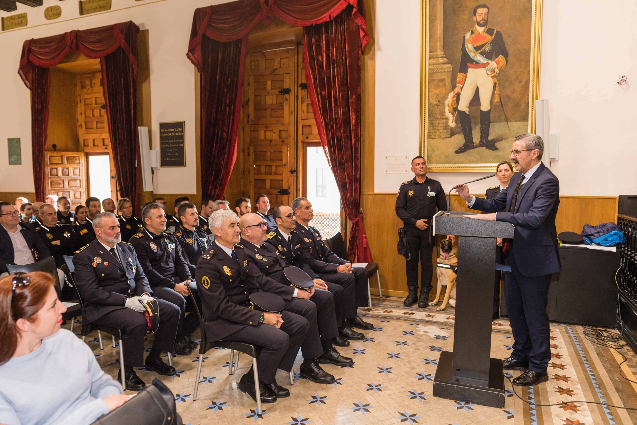 El alcalde, Carlos González, el secretario autonómico de Seguridad y Emergencias, José María Ángel Batalla, el edil de Seguridad Ciudadana, Ramón Abad, el jefe de la Policía Local de Elche, César Zaragoza, miembros del Equipo de Gobierno y de la Corporación Municipal participan en el acto celebrado esta mañana en el Salón de Plenos