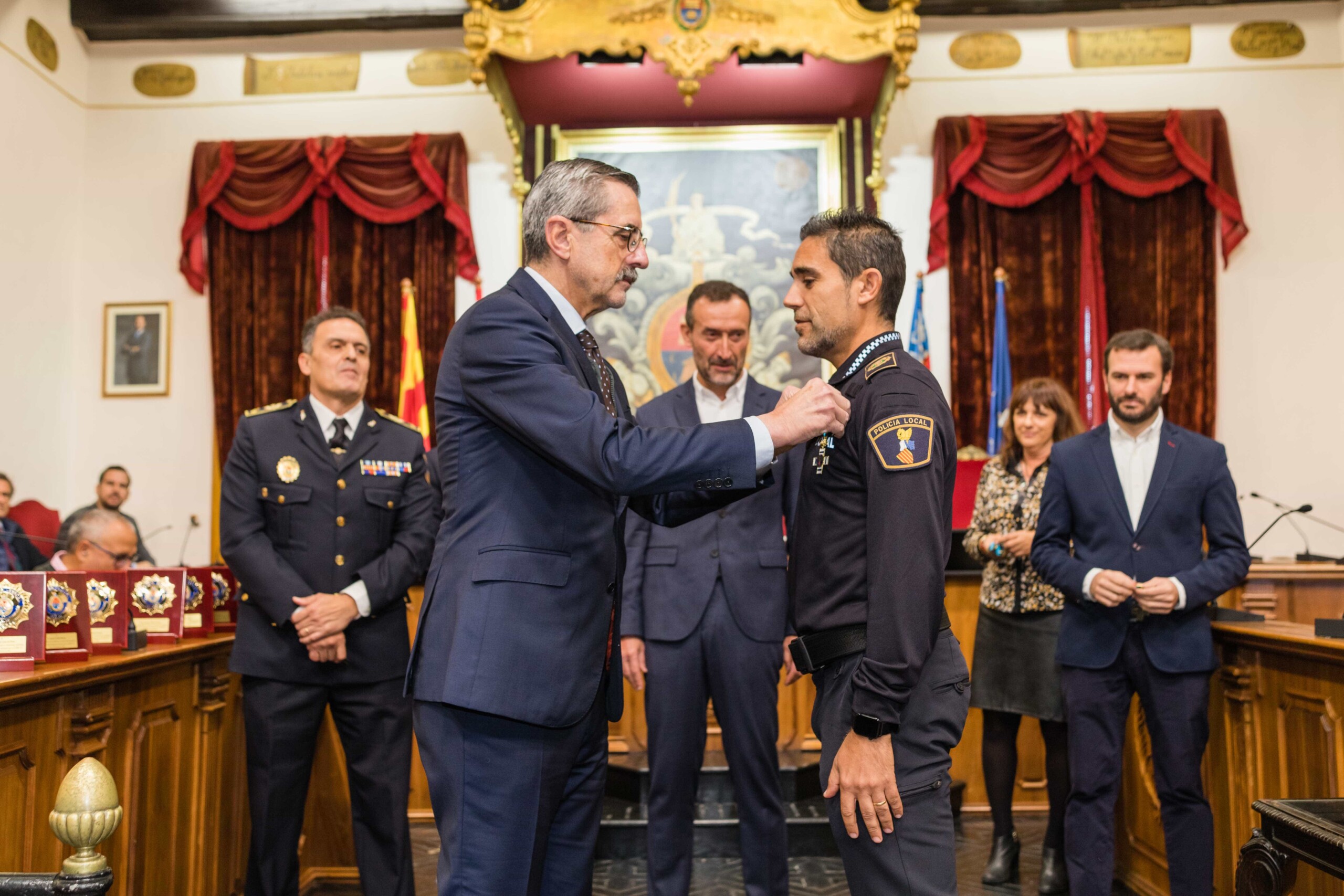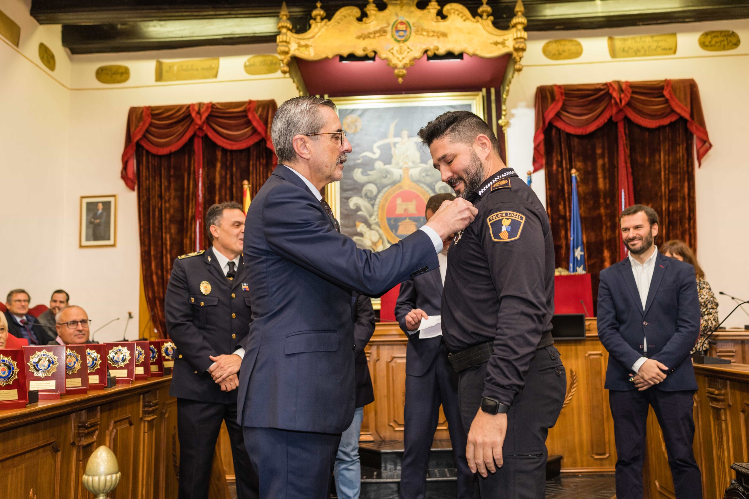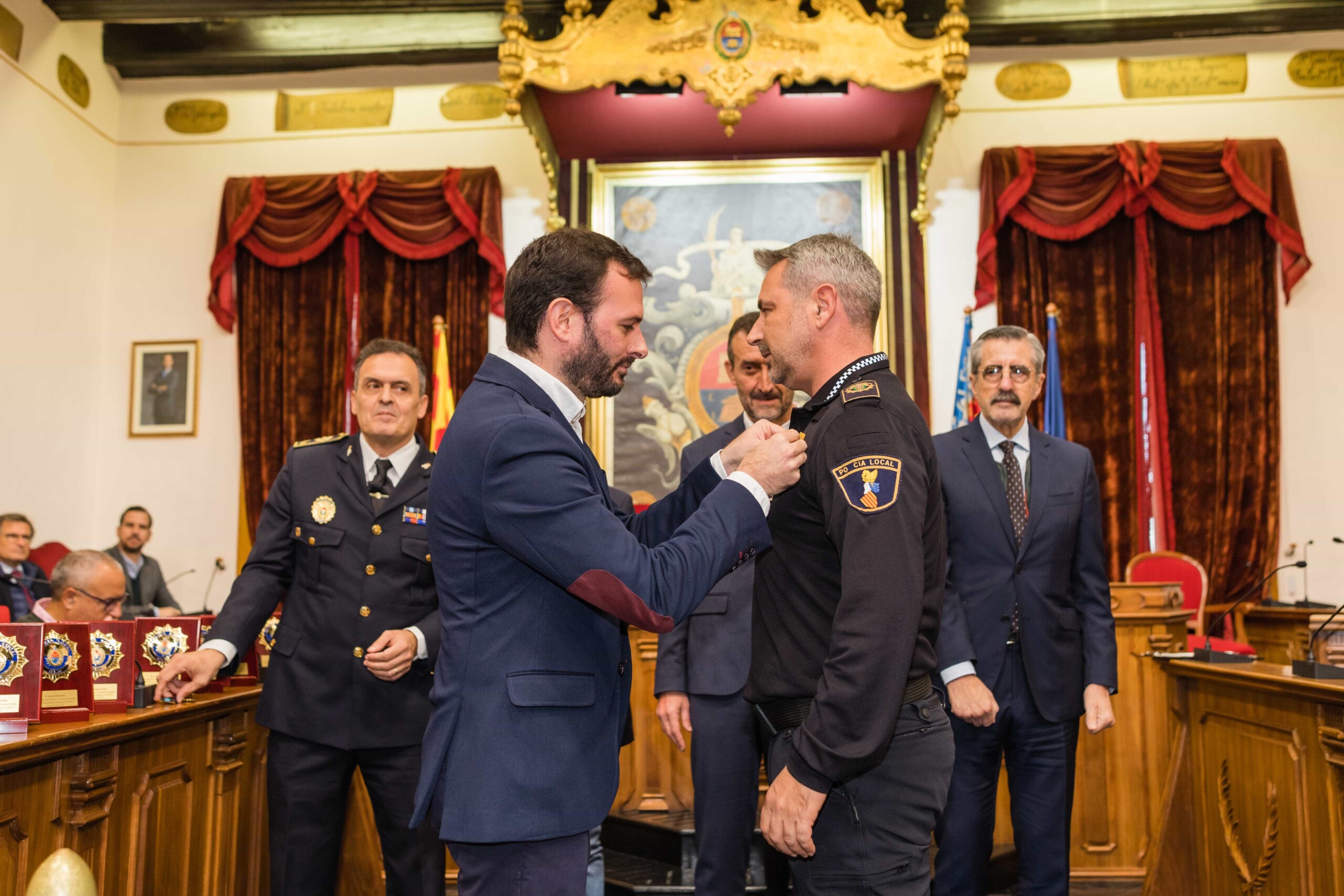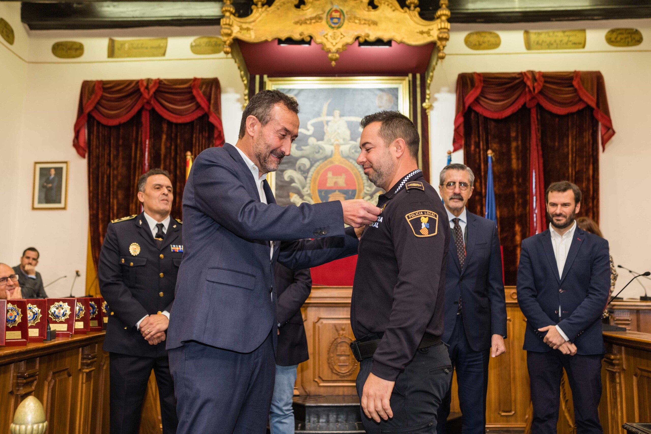 Galardón por su compromiso más allá del deber. Diez agentes de la Policía Local de Elche han sido condecorados con la Cruz al Mérito Policial con Distintivo Azul esta mañana en el Salón de Plenos del Ayuntamiento de Elche por su trabajo en la noche del 1 de octubre de 2021, cuando sospecharon de la documentación de un camionero que cubría el trayecto entre Almería y Países Bajos. Los efectivos del cuerpo de seguridad municipal, incluso algunos de ellos fuera de servicio, registraron la carga y hallaron 500 kilos de marihuana y hachís, hecho que permitió desarticular una organización de tráfico de drogas a escala internacional, la cual, además, poseía una nave de prensado de las propias sustancias en el Camp d’Elx.