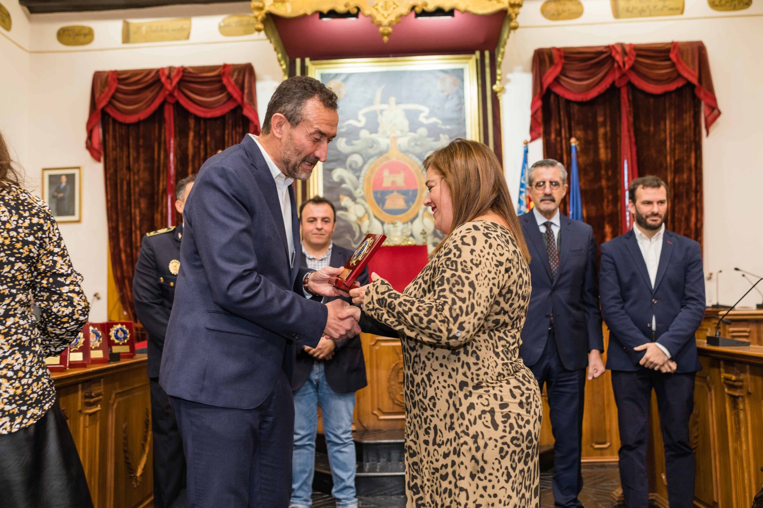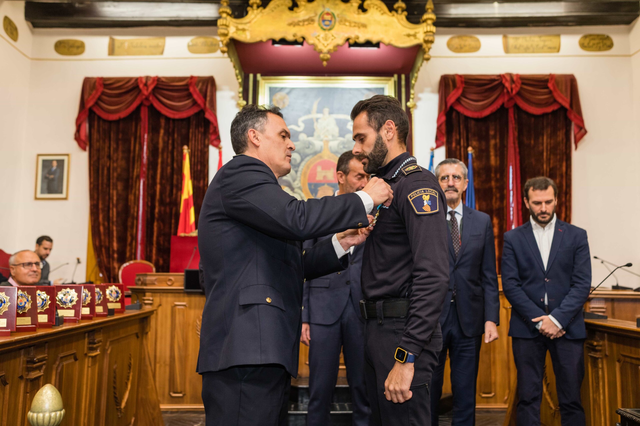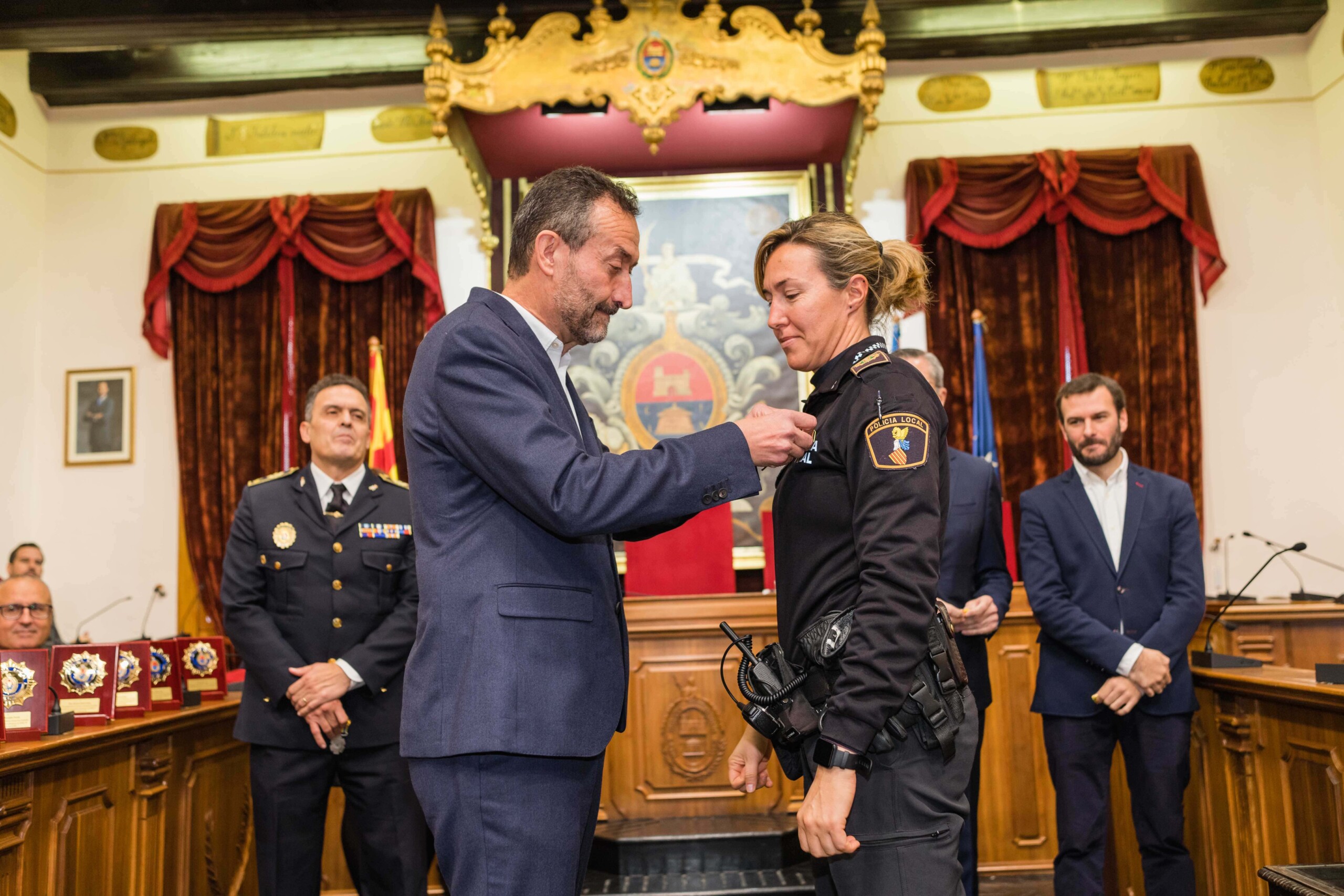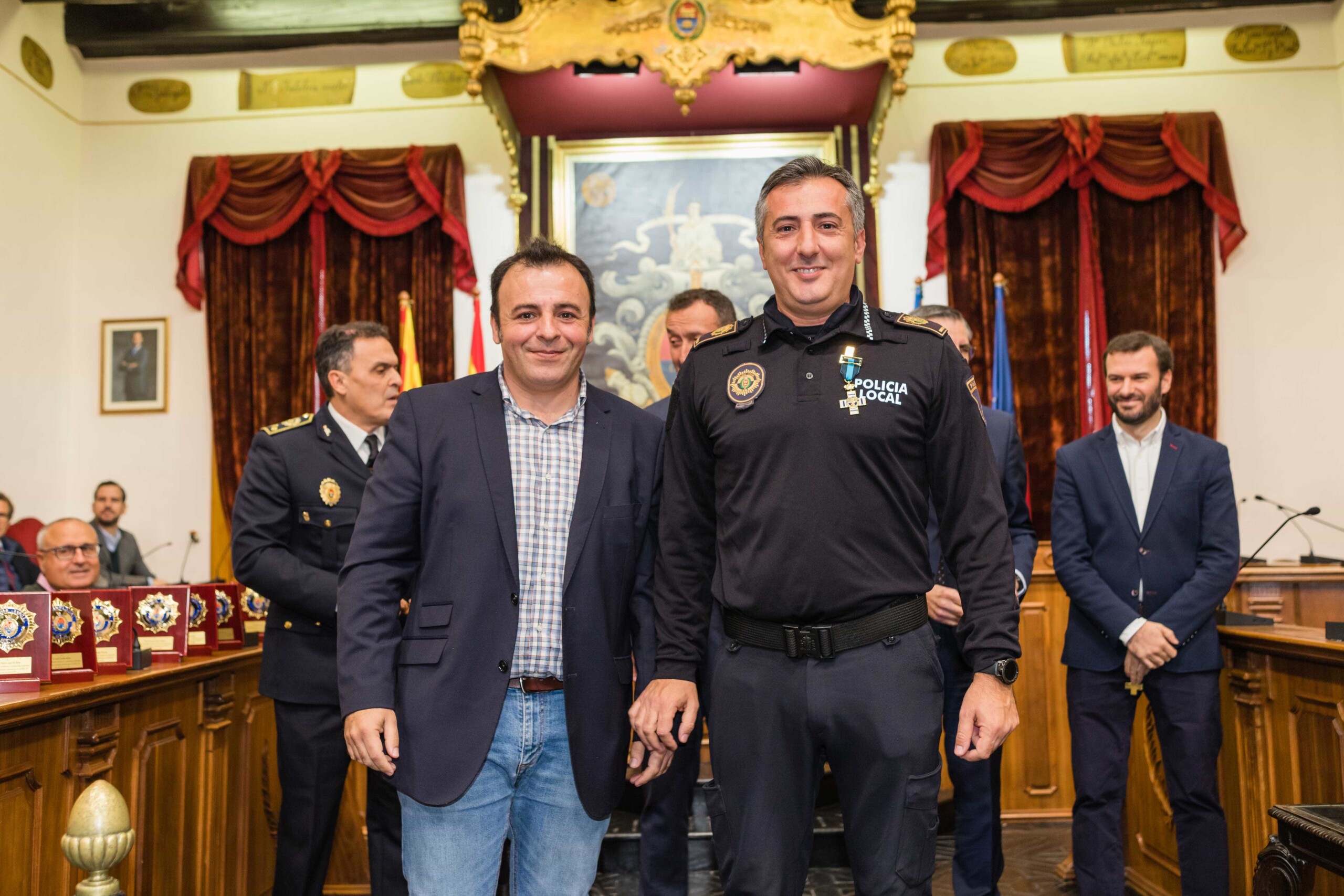 Galardón por su compromiso más allá del deber. Diez agentes de la Policía Local de Elche han sido condecorados con la Cruz al Mérito Policial con Distintivo Azul esta mañana en el Salón de Plenos del Ayuntamiento de Elche por su trabajo en la noche del 1 de octubre de 2021, cuando sospecharon de la documentación de un camionero que cubría el trayecto entre Almería y Países Bajos. Los efectivos del cuerpo de seguridad municipal, incluso algunos de ellos fuera de servicio, registraron la carga y hallaron 500 kilos de marihuana y hachís, hecho que permitió desarticular una organización de tráfico de drogas a escala internacional, la cual, además, poseía una nave de prensado de las propias sustancias en el Camp d’Elx.