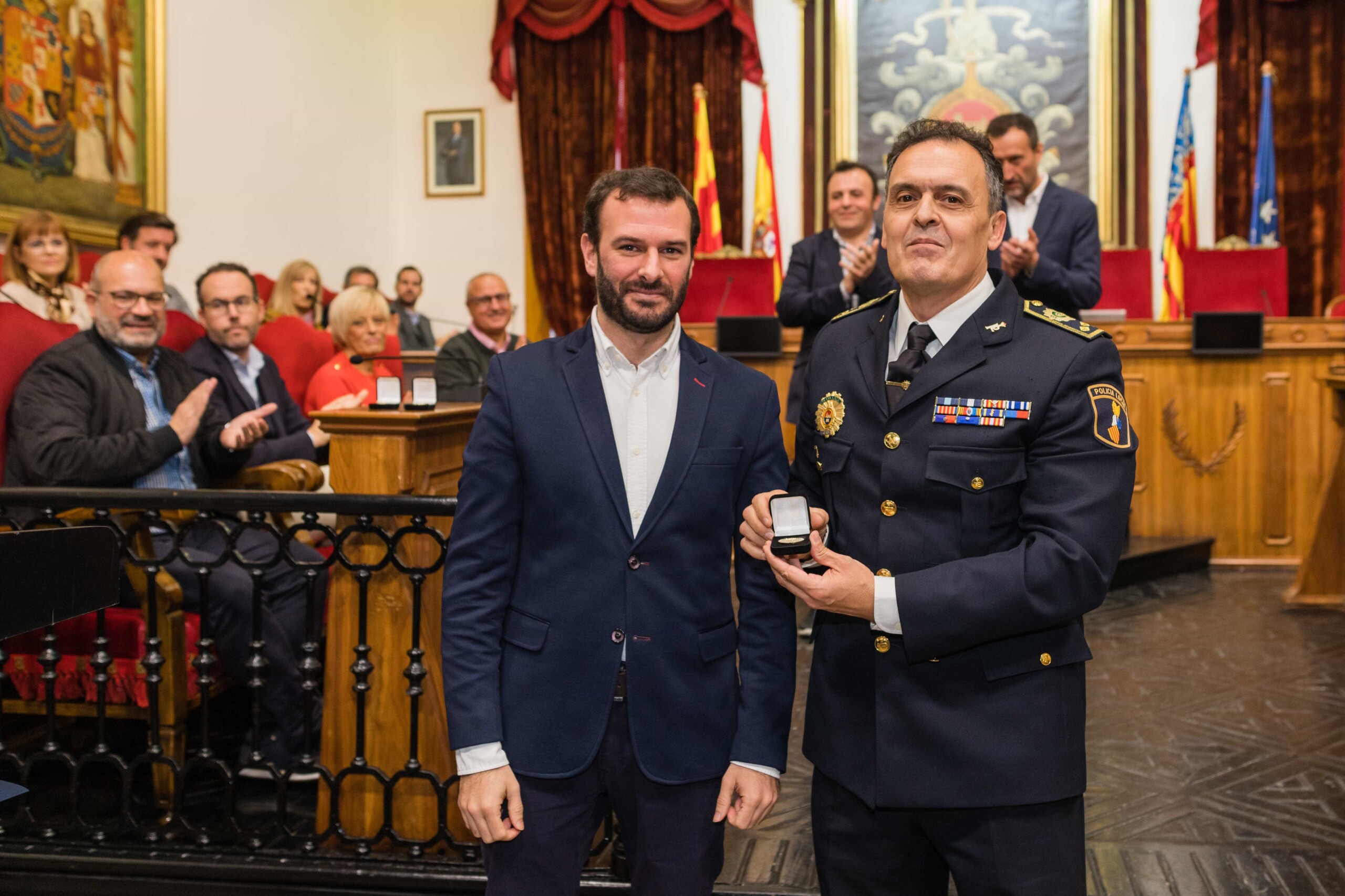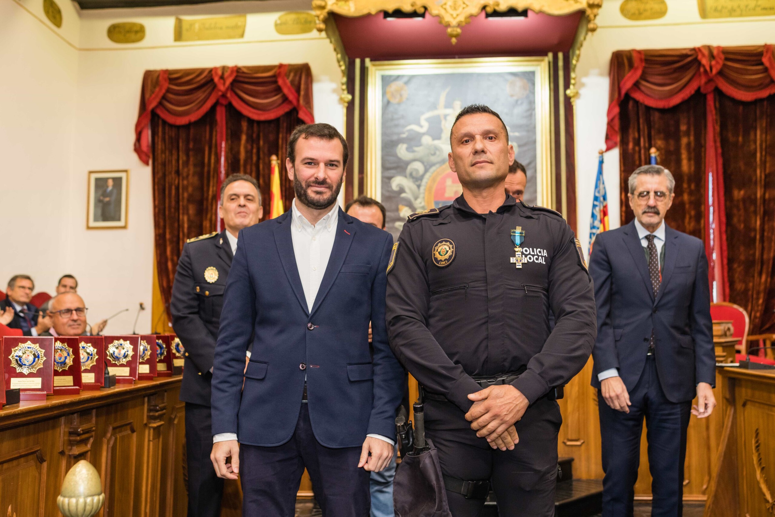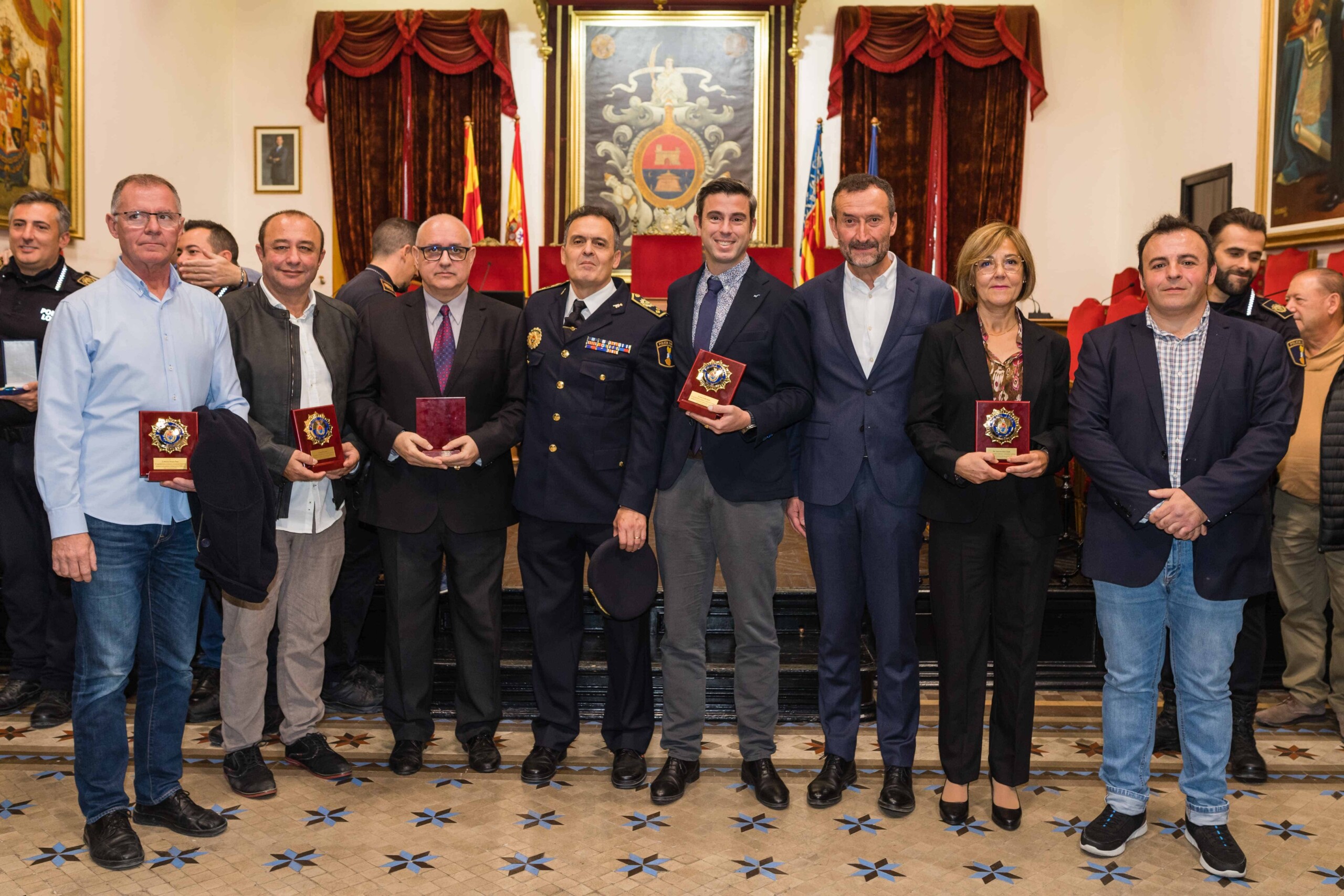 Sus nombres, Antonio Núñez Guijarro, Jorge Israel Agulló Sánchez, David Espinola Sánchez, Juan José Coves Alonso, Juan Carlos Buyolo Martínez, David Pomares Caballero, Antonio Mira Cayuelas, Alfonso Díaz Vielva, Raúl Soto Esclapez y Rafael Alemañ Alonso. El alcalde, Carlos González; el secretario autonómico de Seguridad y Emergencias, José María Ángel Batalla; el edil de Seguridad Ciudadana, Ramón Abad; el jefe de la Policía Local de Elche, César Zaragoza; y el director general de Operativa, Salvador Almenar, acompañados por miembros del Equipo de Gobierno y de la Corporación Municipal, les han hecho entrega de las cruces con Distinto Azul ante los aplausos de familiares y amigos.