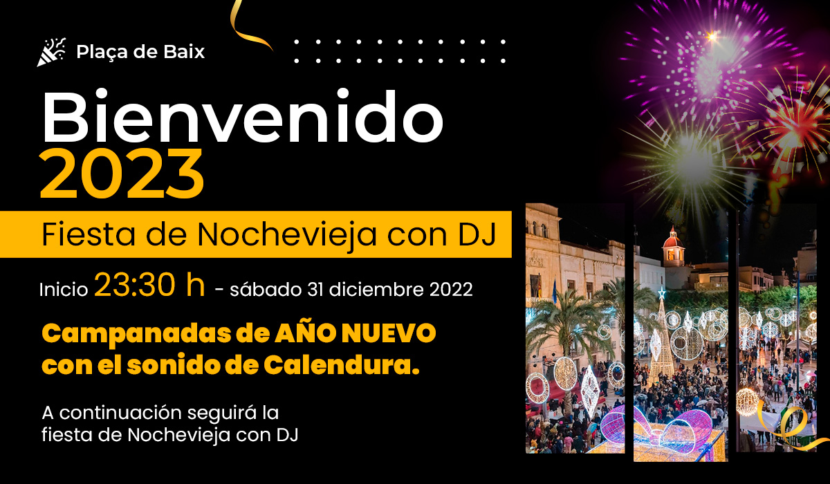 La Fiesta de Nochevieja dará comienzo a las 23:30 horas y en ella actuará el DJ ilicitano Jesús Rodríguez, quien animará la Plaça de Baix con una sesión de música que se prolongará hasta las 04:00 de la madrugada. A las 24:00 se producirá la pausa que dará inicio al año nuevo para tomar las tradicionales uvas con el toque de las campanadas de Calendura.