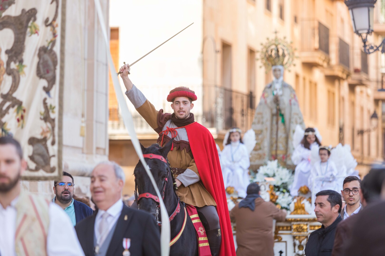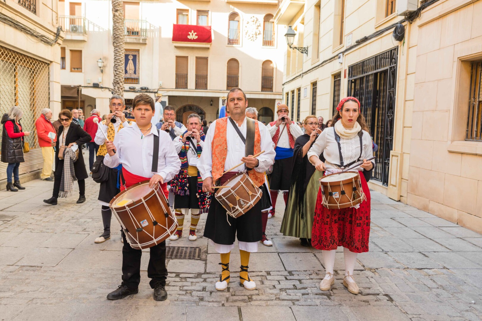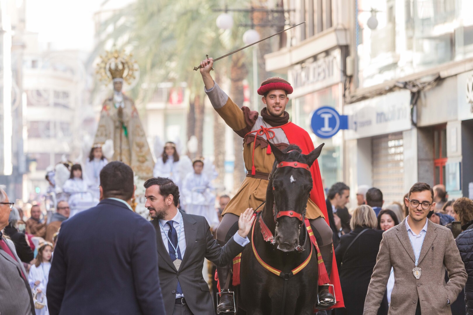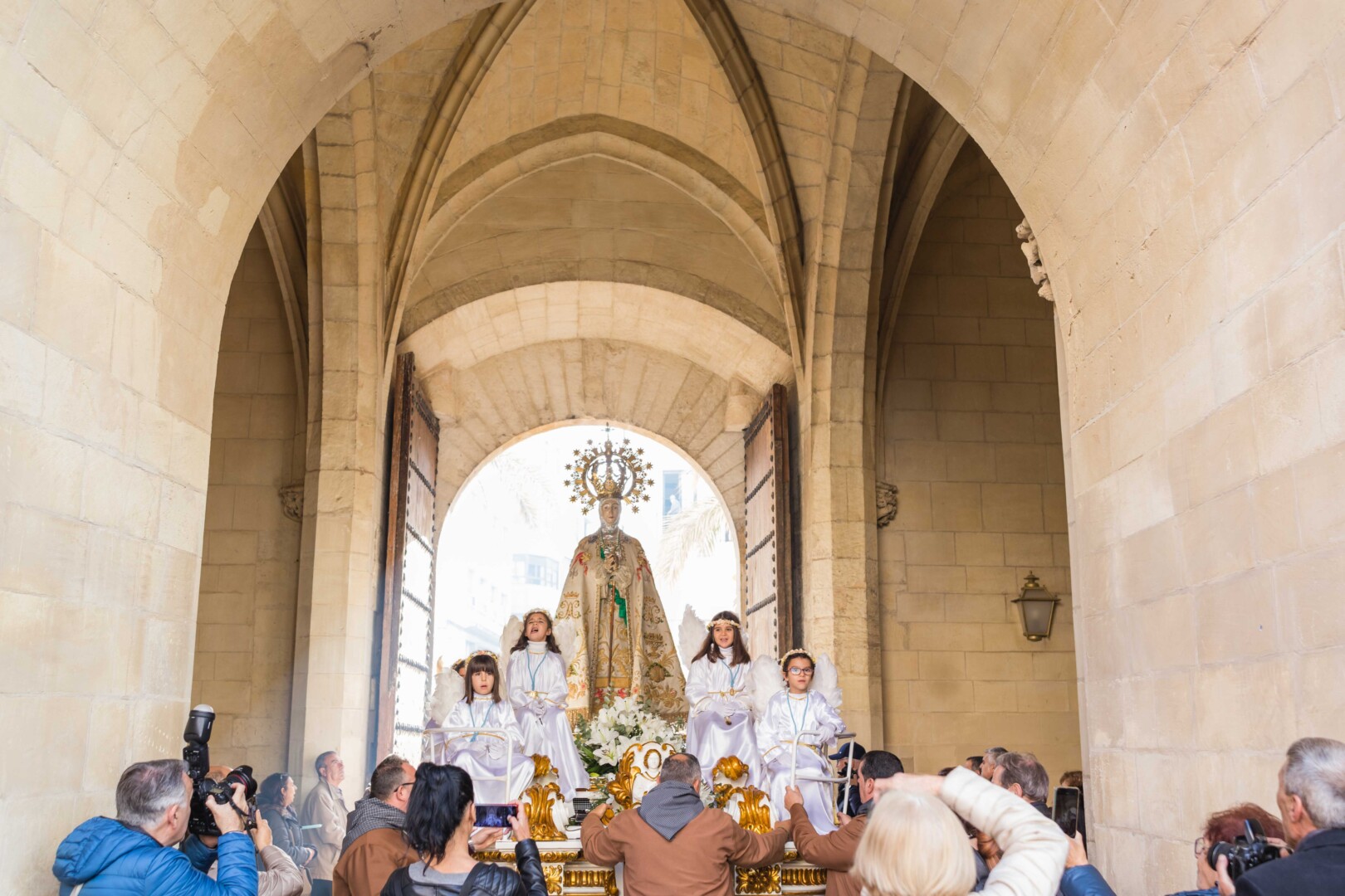 Los santos y la Patrona de Elche han desfilado por las calles del centro, en un recorrido iniciado a las 11:00 horas en la basílica de Santa María y que ha congregado a centenares de personas, las cuales han sido testigos del acontecimiento histórico que recuerda el 650 aniversario del feliz encuentro entre el guardacostas Francesc Cantó y la Virgen; una procesión conmemorativa que no pudo celebrase en 2020, año de la efeméride, por la emergencia sanitaria.