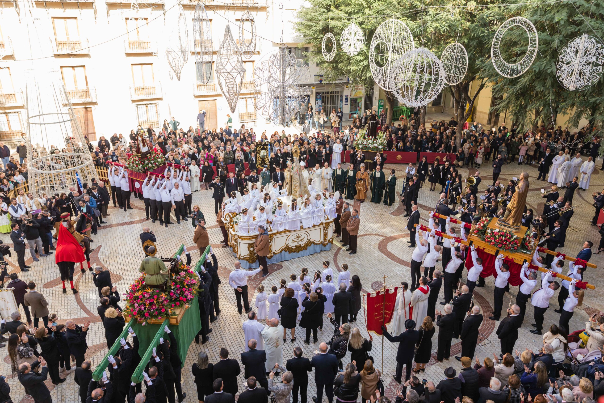 Histórico y emotivo encuentro de las imágenes de San Antón, San Crispín, San Pascual Bailón y San Agatángelo con la talla de la Mare de Déu en la Plaça de Baix durante la Procesión de la Venida de la Virgen, un hecho que no se producía desde 1870 por el V Cententario del hallazgo en la playa del Tamarit.