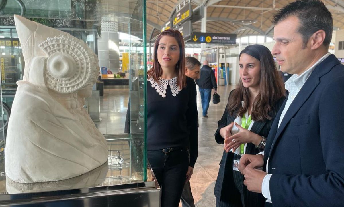 El concejal de Turismo, Carles Molina, y la edil de Cultura, Marga Antón, visitan la zona de facturación donde se ha instalado el busto íbero, que se ubicaba en la antigua terminal y ahora permanecerá en este nuevo espacio