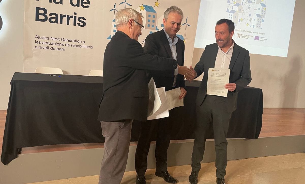 Carlos González, acompañado por la edil de Urbanismo, Ana Arabid, sella el acuerdo “de enorme trascendencia” con el vicepresidente del Consell, Héctor Illueca, que resolverá los problemas de estructura y mejorará la accesibilidad, entre otras actuaciones, de los 18 edificios del vecindario ilicitano