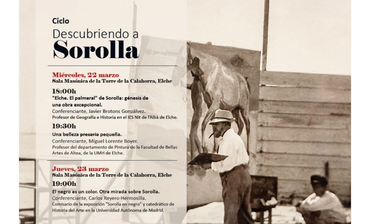 Las charlas comenzarán mañana, 22 de marzo, a las 18:00 horas en la Sala Masónica de la Torre de la Calahorra con las intervenciones de Javier Brotons, profesor de Geografía e Historia del instituto Nit de l’Albà de Elche con la ponencia “Elche. El Palmeral” de Sorolla: génesis de una obra excepcional, y de Miguel Lorente, profesor del departamento de Pintura de la Facultad de Bellas Artes de Altea, de la Universidad Miguel Hernández de Elche (UMHE), con “Una belleza precaria pequeña”. El jueves, 23 de marzo, a las 19:00 horas tendrá lugar la intervención de Carlos Reyero, catedrático de Historia del Arte de la Universidad Autónoma de Madrid, con “El negro es un color. Otra mirada sobre Sorolla”.