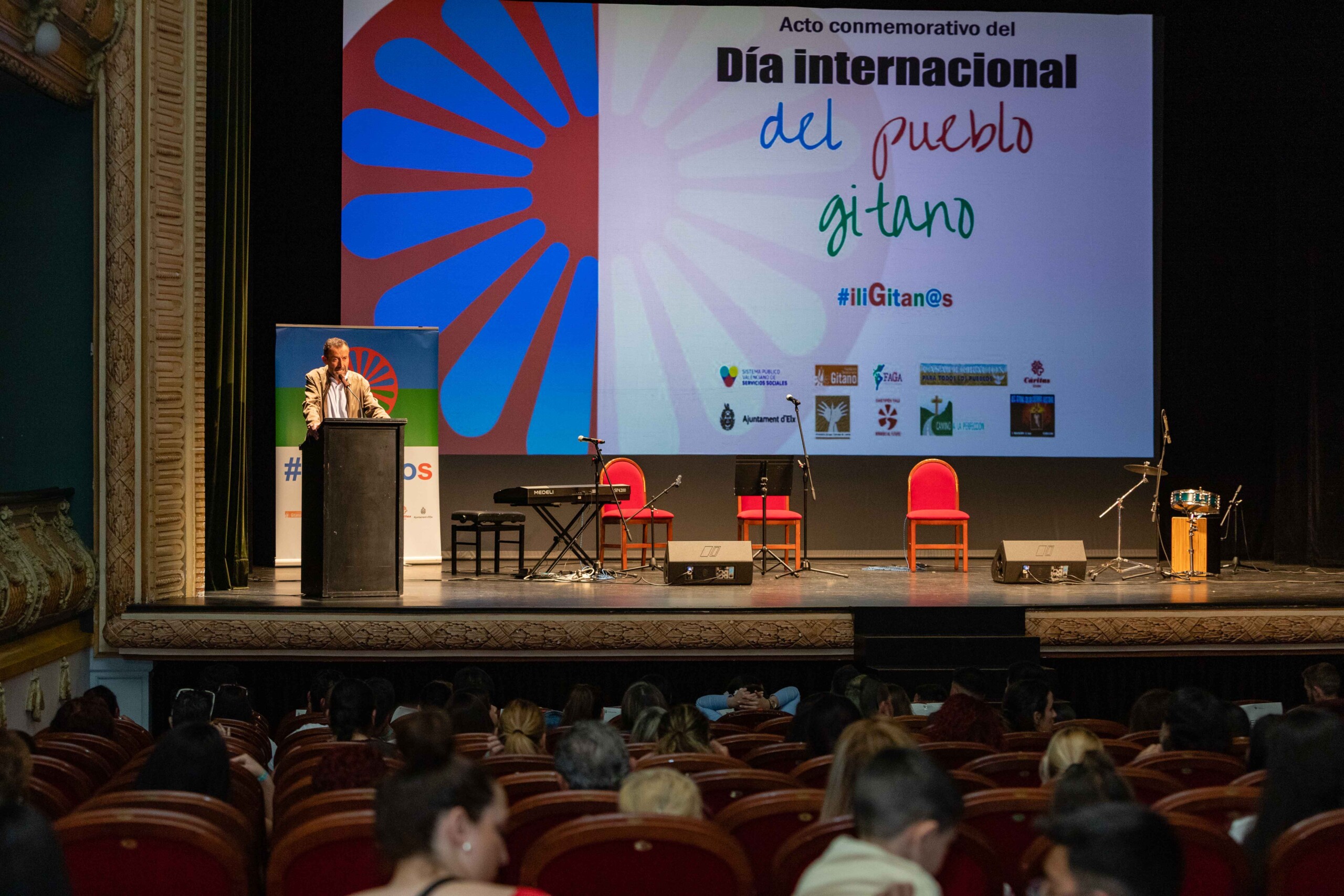 El Gran Teatro ha albergadoel multitudinario acto institucional del Día Internacional del Pueblo Gitano, cuya efeméride fue el pasado sábado 8 de abril. El evento, que por primera vez tiene lugar en la centenaria instalación cultural luego de que en anteriores ediciones se celebrara en el Centro de Congresos ha contado con la participación del alcalde, Carlos González, y del edil de Políticas Inclusivas, Mariano Valera, que han estado acompañados por miembros del Equipo de Gobierno, de la Corporación Municipal, así como por representantes de la comunidad calé ilicitana.