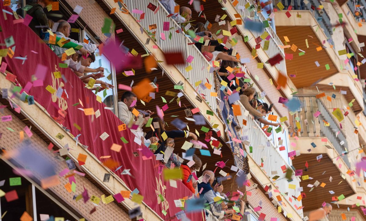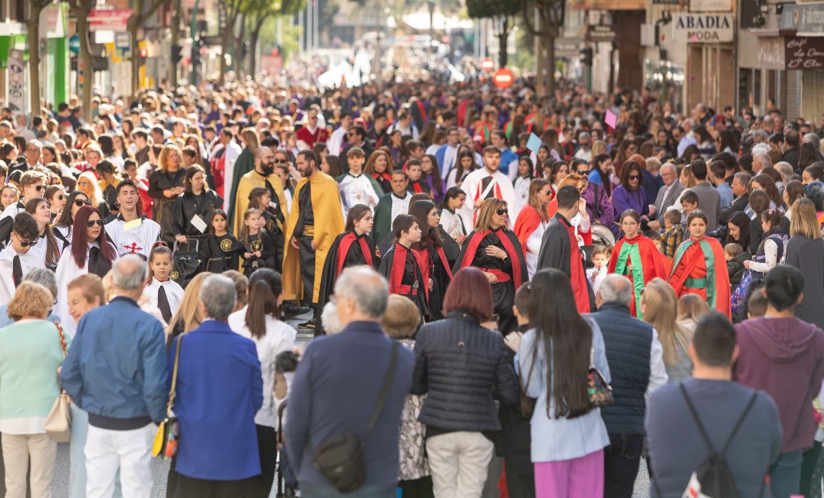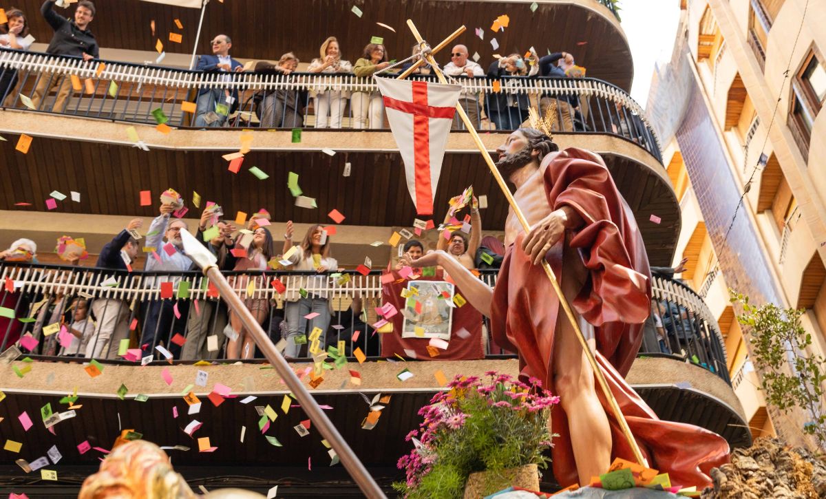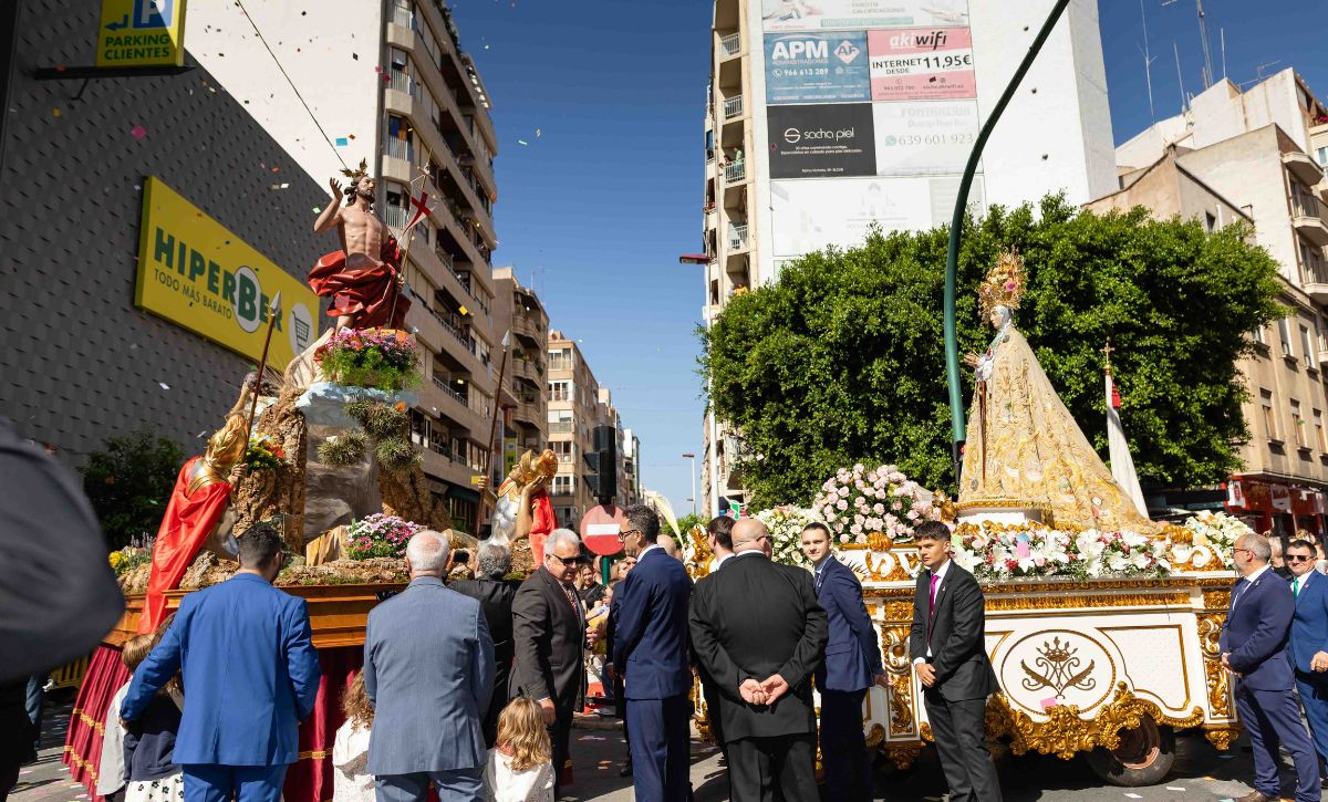 La Procesión de las Aleluyas ha teñido de colores el Domingo de Pascua en Elche y ha clausurado la Semana Santa de 2023. Miles de personas han arropado las imágenes de la Virgen de la Asunción y de Jesús Triunfante por las calles de la ciudad entre aplausos y vítores, y una incesante lluvia de las populares estampas lanzadas desde ventanas, balcones y terrazas. Todo ello como muestra de alegría colectiva ante Cristo resucitado, siendo el momento culmen el encuentro entre madre e hijo a mediodía, en el cruce de las calles Jorge Juan y Reina Victoria.