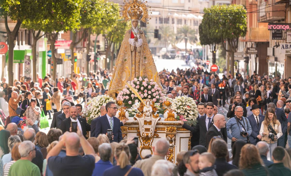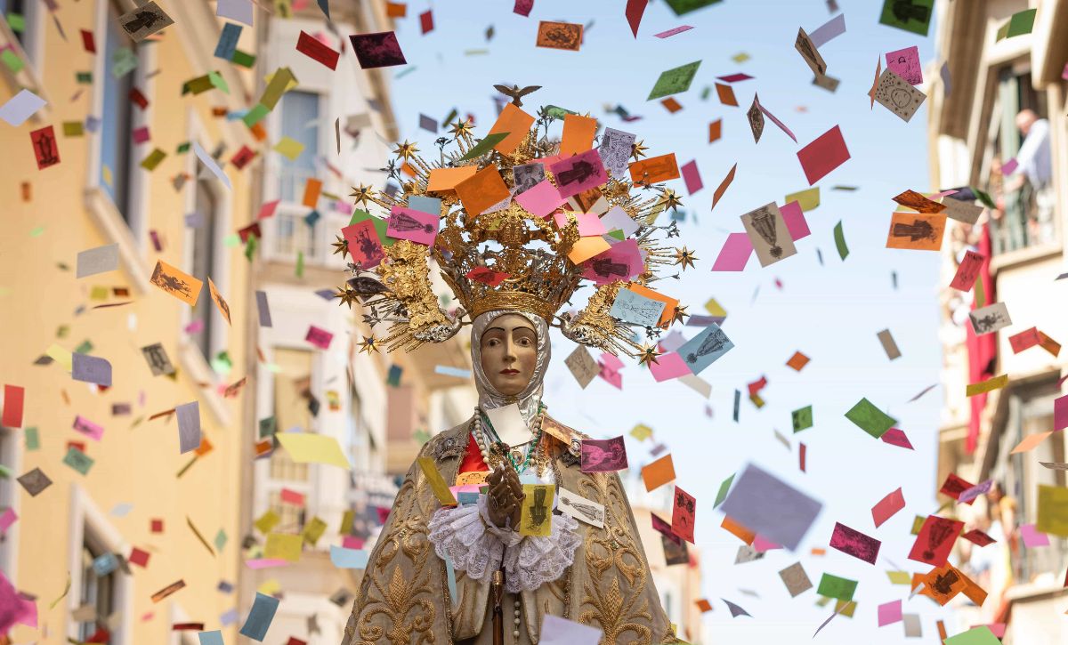 Miles de personas arroparon las imágenes de la Virgen de la Asunción y de Jesús Triunfante por las calles de la ciudad entre una incesante lluvia de las populares estampas, siendo el momento culmen de la celebración el encuentro entre madre e hijo en el cruce de las calles Jorge Juan y Reina Victoria