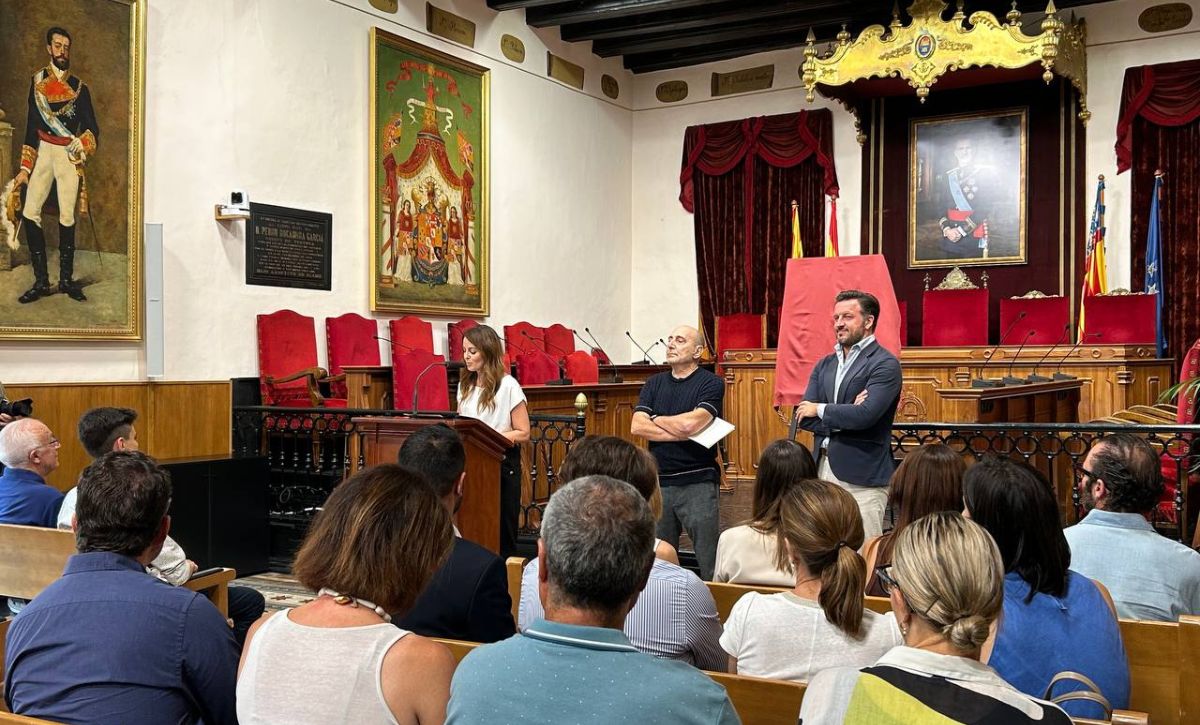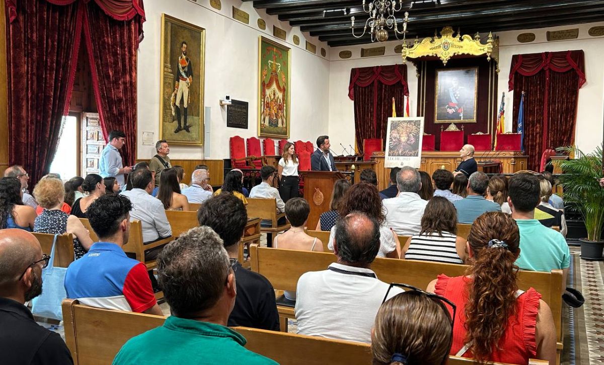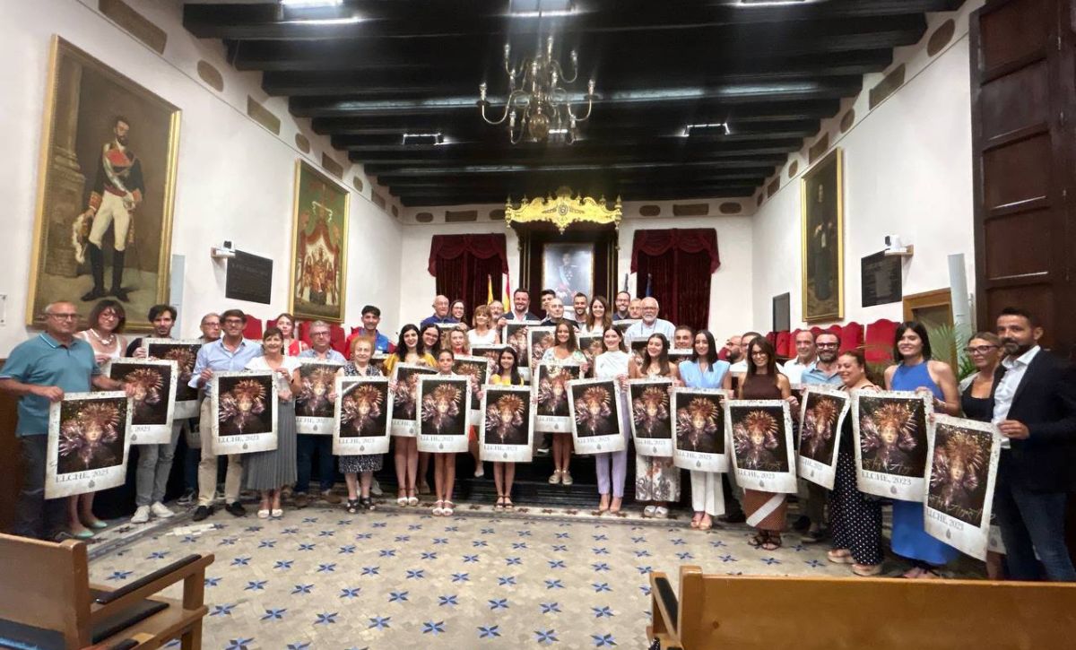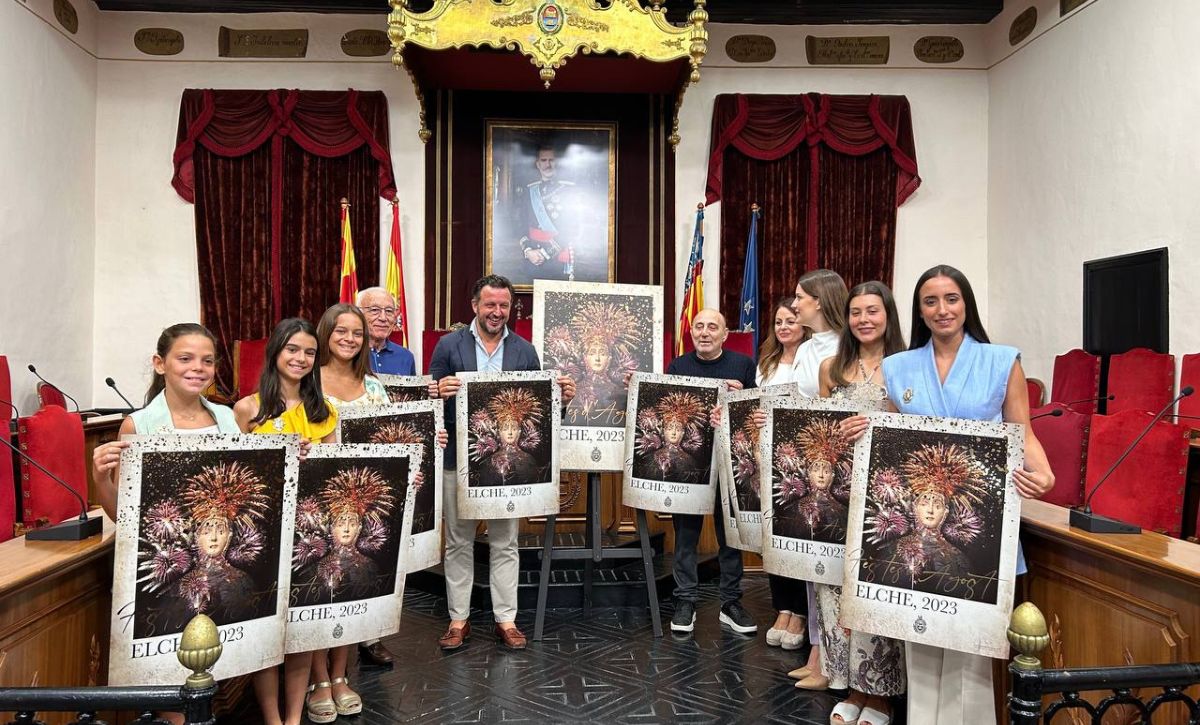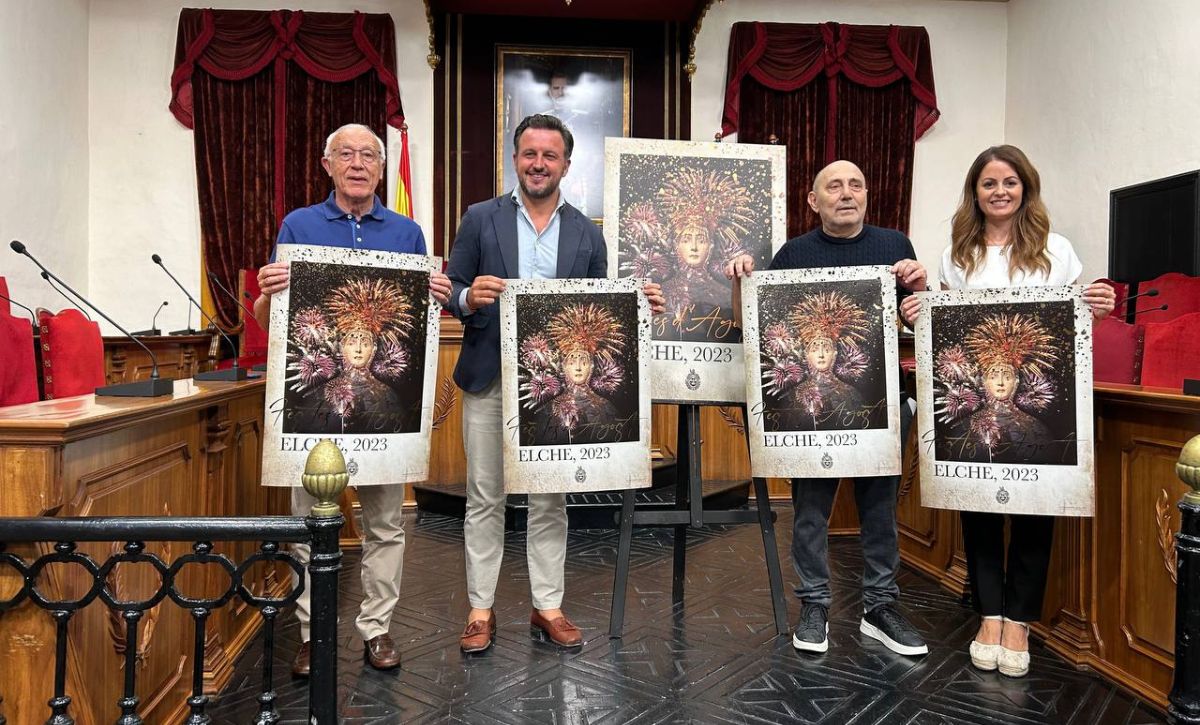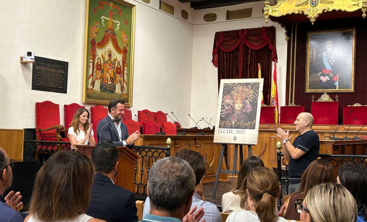 Elche ya tiene el cartel anunciador de las fiestas de agosto de 2023. El autor es el artista ilicitano Antonio Mora, quien ha presentado esta mañana su obra en el salón de plenos ante la presencia de la corporación municipal y representantes de las entidades festeras, culturales y sociales de la ciudad.