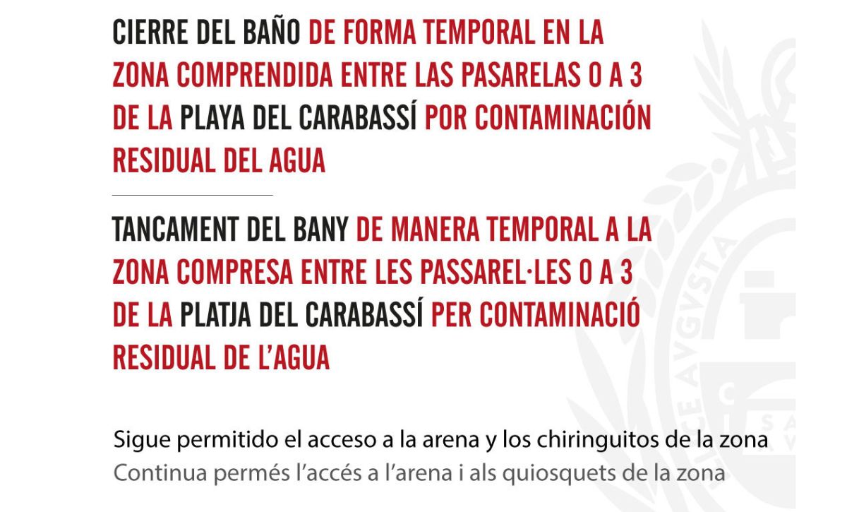 La concejal de Turismo, Irene Ruiz ha informado desde el Ayuntamiento de Elche, a través de la Policía Local, que “esta mañana, desde las 10h y por indicación de la Conselleria de Sanidad, se ha procedido al cierre temporal al baño de la Playa del Carabassí, concretamente el tramo comprendido entre las pasarelas 0 y 3, por contaminación del agua de origen residual”.
