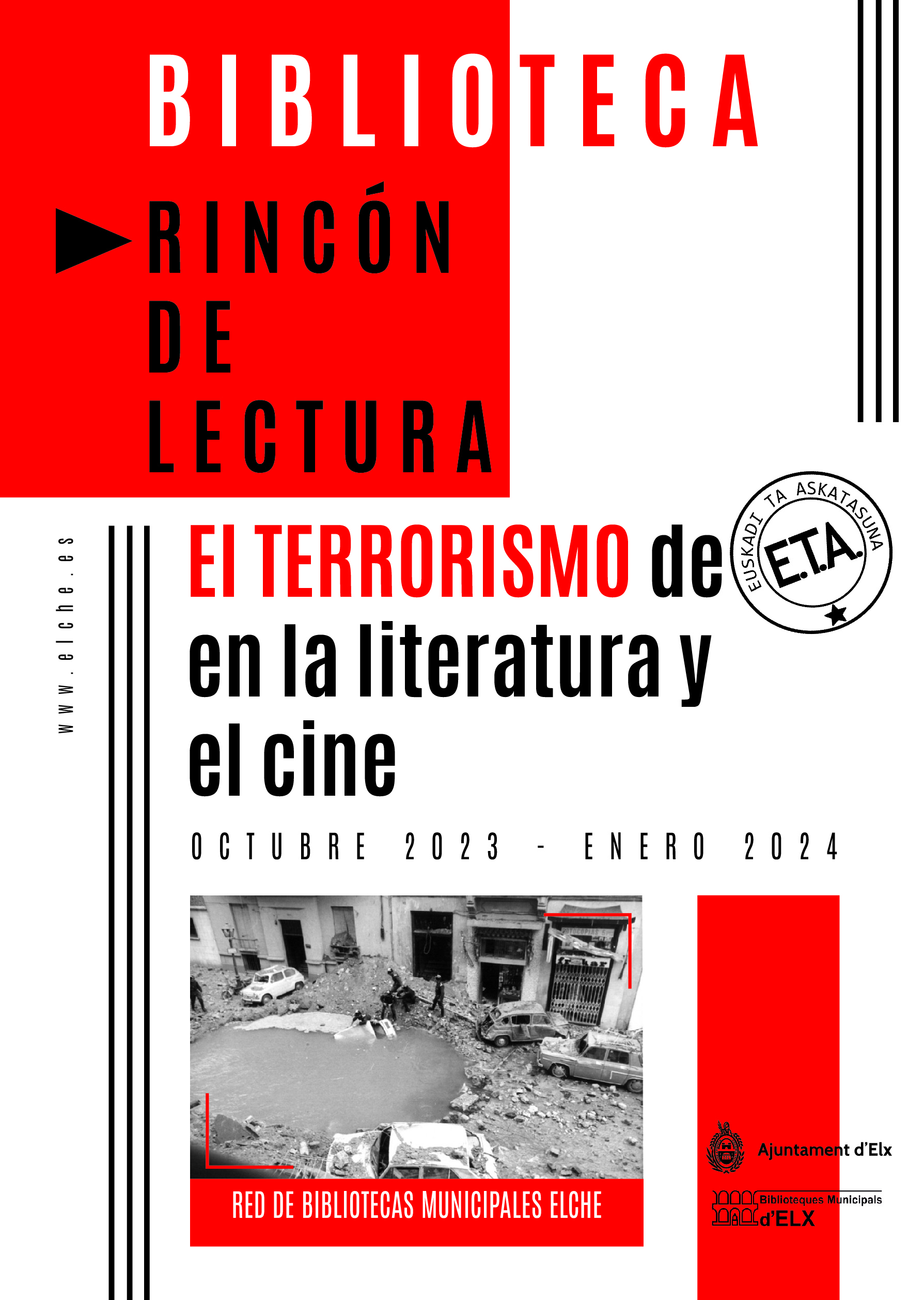 Desde las bibliotecas municipales ofrecemos a nuestros usuarios un nuevo rincón de lectura, «El terrorismo de ETA en la literatura y el cine» en el que se recogen los fondos relacionados con la temática del terrorismo etarra.