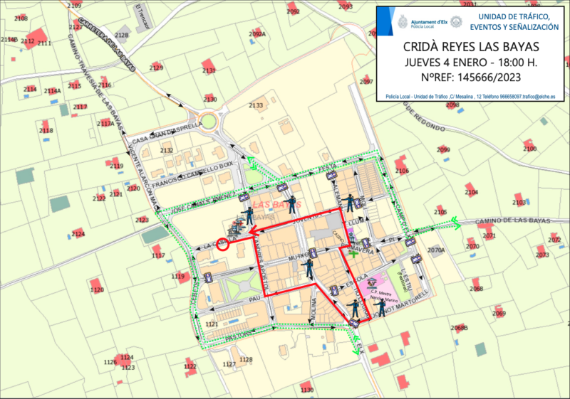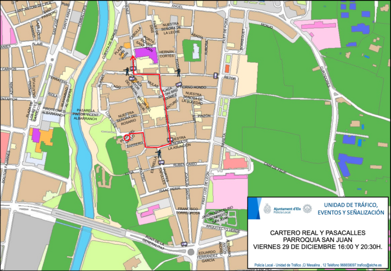 📍Itinerario: Plaça de Baix, Corredora, Joan Carles I, Daoiz, Velarde, Plaza de la Constitución, Almórida, Filet de Fora, Fray Luis de León, Puertas Tahúllas, Ntra. Sra. de la Asunción, Major del Raval, Plaza del Raval, San Juan, Juan Ramón Jiménez, Puente Santa Teresa, Santa Ana, Plaza Reyes Católicos (carril este), Fernanda Santamaría, Asilo, Paseo Germanías, Major del Pla, Plaça del Pont, Camilo Flamarión, Reina Victoria, Puente de Canalejas, Salitre, Major de la Vila, Uberna, Plaça del Congrés Eucarístic, Uberna, Plaza de la Merced, Capità Lagier, Pont dels Ortissos, Corredora a Plaça de Baix