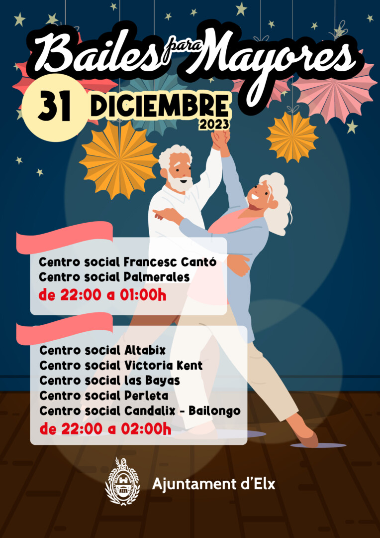 Además, el mismo día de fin de año, el 31 de diciembre, a petición de los mayores, se celebrarán más bailes. De 22:00h a 01:00h podrán disfrutar de ellos en los Centros Sociales de Francesc Cantó y de Palmerales. En los centros sociales de Candalix (Bailongo), Altabix, Victoria Kent, Las Bayas y Perleta los bailes serán de 22:00h a 02:00h y también se repetirá de nuevo el baile en el Centro Cívico de Candalix de 22:00h a 02:00h.