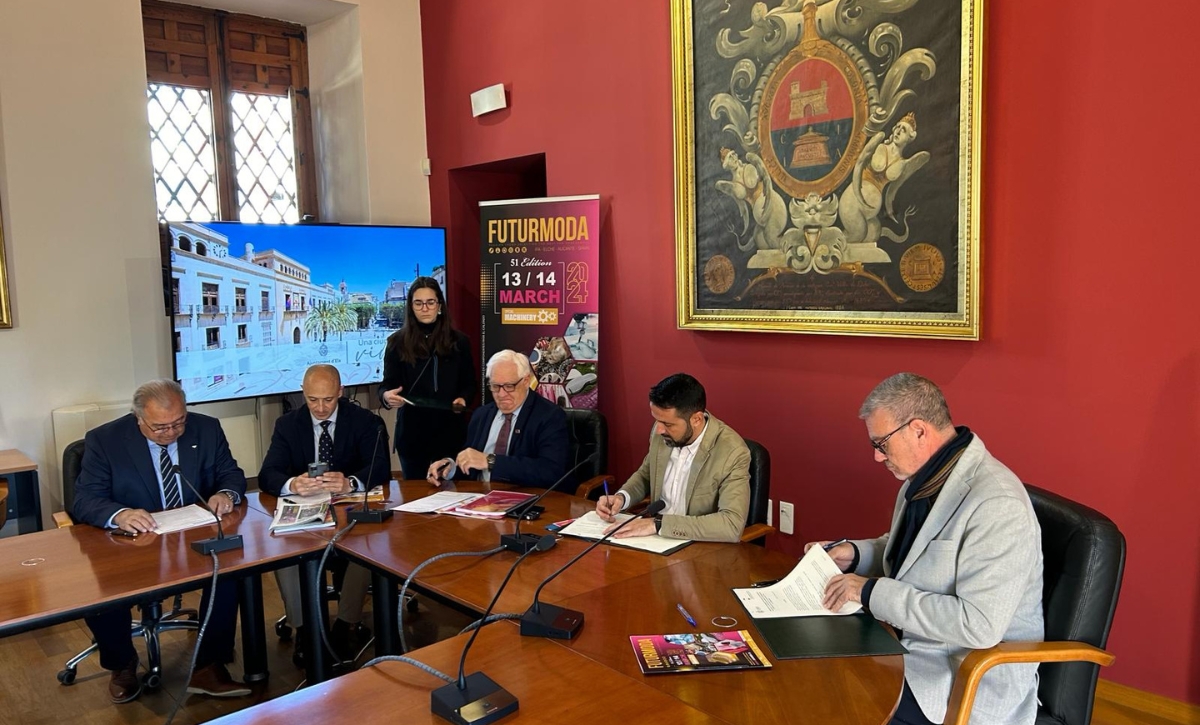La Sala del Consell ha acogido la firma del convenio de colaboración entre el Ayuntamiento de Elche y la Asociación Española de Empresas de Componentes para el Calzado (AEC) para Futurmoda 2024, la Feria Internacional de Componentes para el Calzado y la Marroquinería.