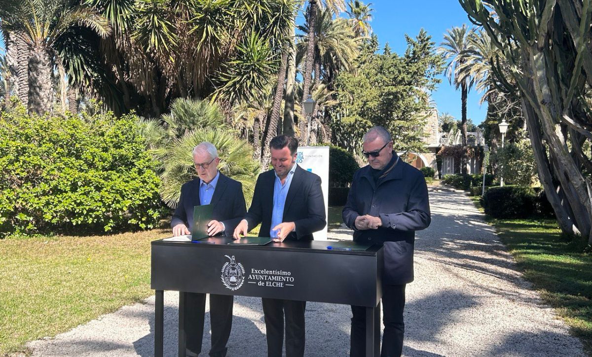 El alcalde de Elche, Pablo Ruz, y el presidente de la Fundación Mediterráneo, Luis Boyer, han firmado un convenio para la cesión de uso temporal de los jardines de l’Hort del Xocolater y abrirlo a la ciudadanía para la realización de eventos culturales o sociales de carácter público organizados directamente por el Ayuntamiento.