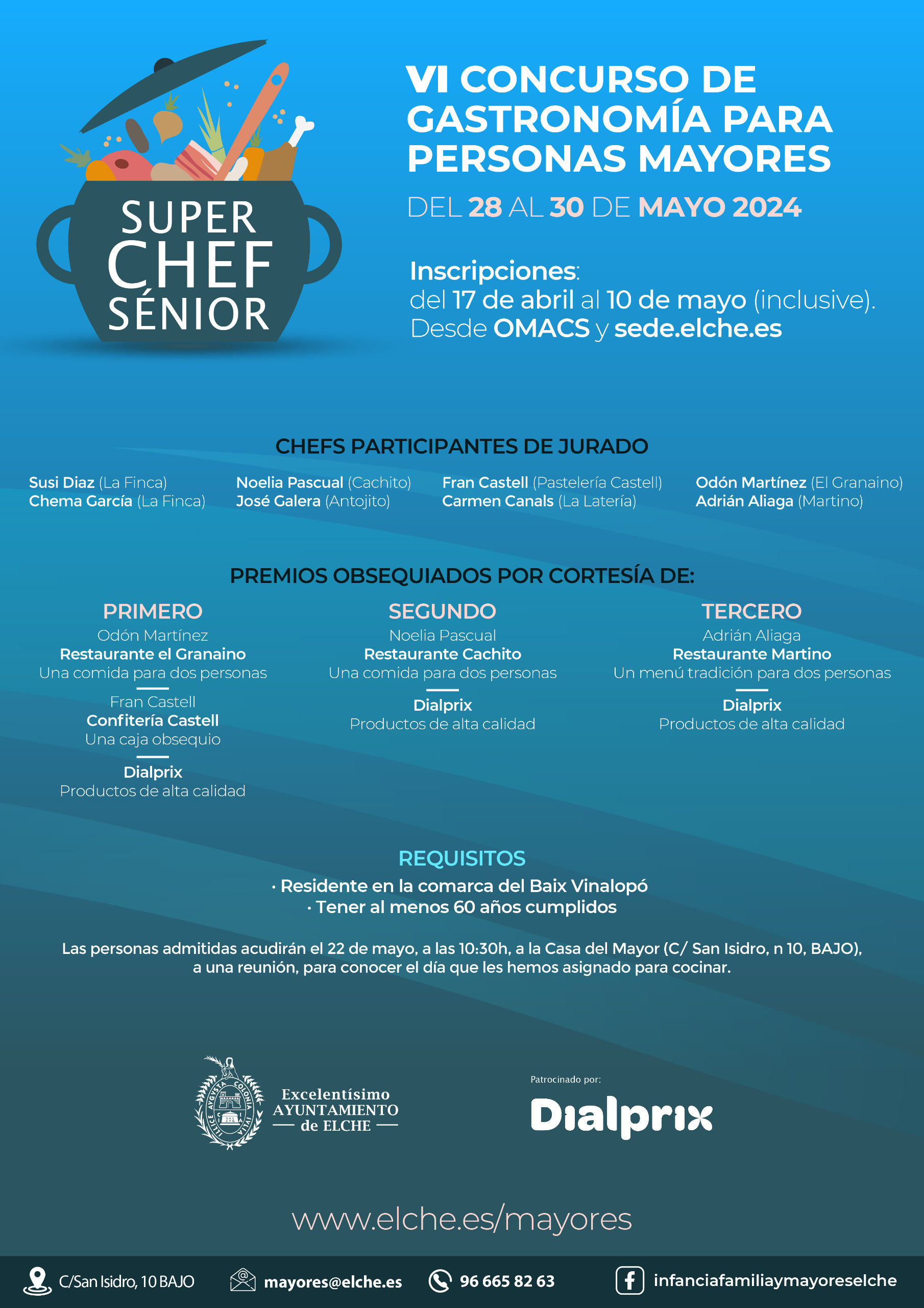 El Ayuntamiento de Elche, a través de la concejalía de Mayores, ha organizado la VI edición del Concurso de Gastronomía para Personas Mayores ‘Superchef Sénior’ que tendrá lugar del 28 al 30 de mayo de 2024 en la Escuela de Hostelería de Elche.