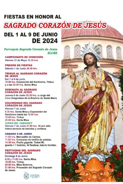 La parroquia Sagrado Corazón de Jesús arranca sus fiestas en honor al santo que se celebrarán desde el viernes 31 de mayo de 2024 con el campeonato de chinchón a las 16:30 horas hasta el domingo 9 de junio, día de la festividad, con la procesión de las 21:00 horas.