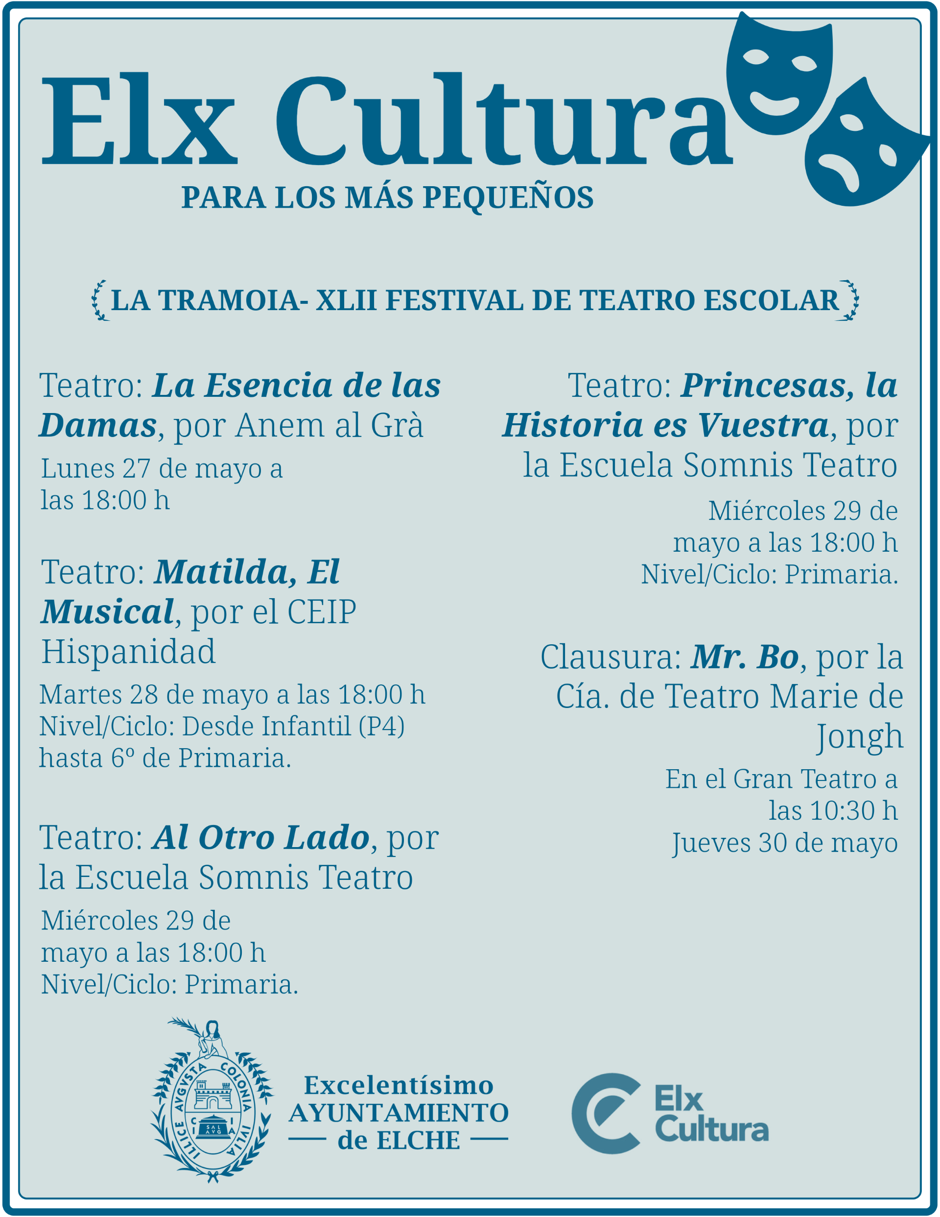 El festival comenzó a principios del mes de mayo con varios talleres dirigidos a los más pequeños y continúa con la representación de obras teatrales de los centros educativos CEIP El Palmeral, CEIP Candalix, CEIP Ferrández Cruz, CEIP Vicente Blasco Ibáñez, CEIP Miguel de Cervantes, La Devesa y CEIP Hispanidad. Además, en esta edición también actuará la Asociación Integra-T o la escuela Somnis Teatro.
