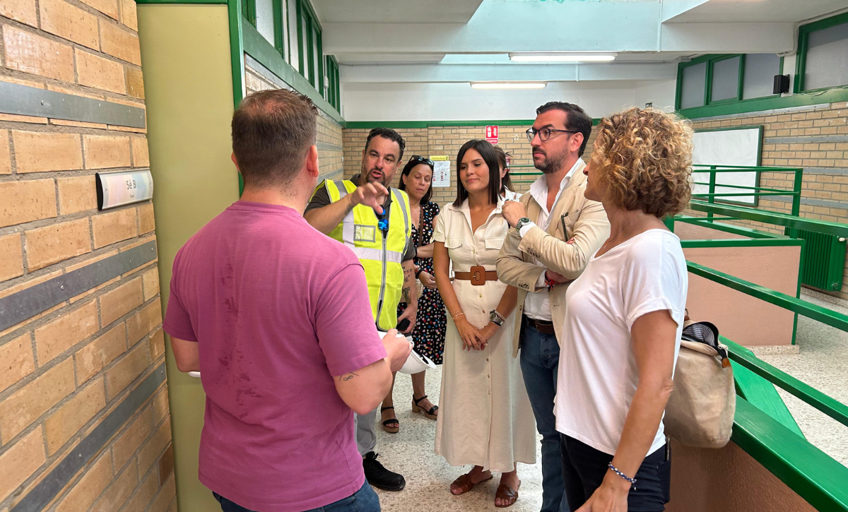 La edil de Educación, María Bonmatí, ha visitado esta mañana las instalaciones del CEIP Miguel de Cervantes, acompañada por el concejal de Contratación, Claudio Guilabert; el concejal de Estrategia Municipal, Francisco Soler y el arquitecto encargado de las obras de reparación de la cubierta, Rafael Santonja.