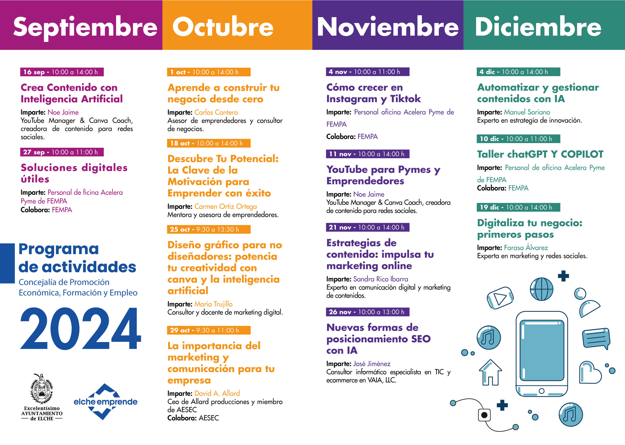Los cursos cuentan con actividades cómo inteligencia artificial, chatGPT, marketing online, diseño gráfico, posicionamiento SEO o emprendimiento desde cero. Todas las actividades serán impartidas por las mañanas durante los meses de septiembre, octubre, noviembre y diciembre.