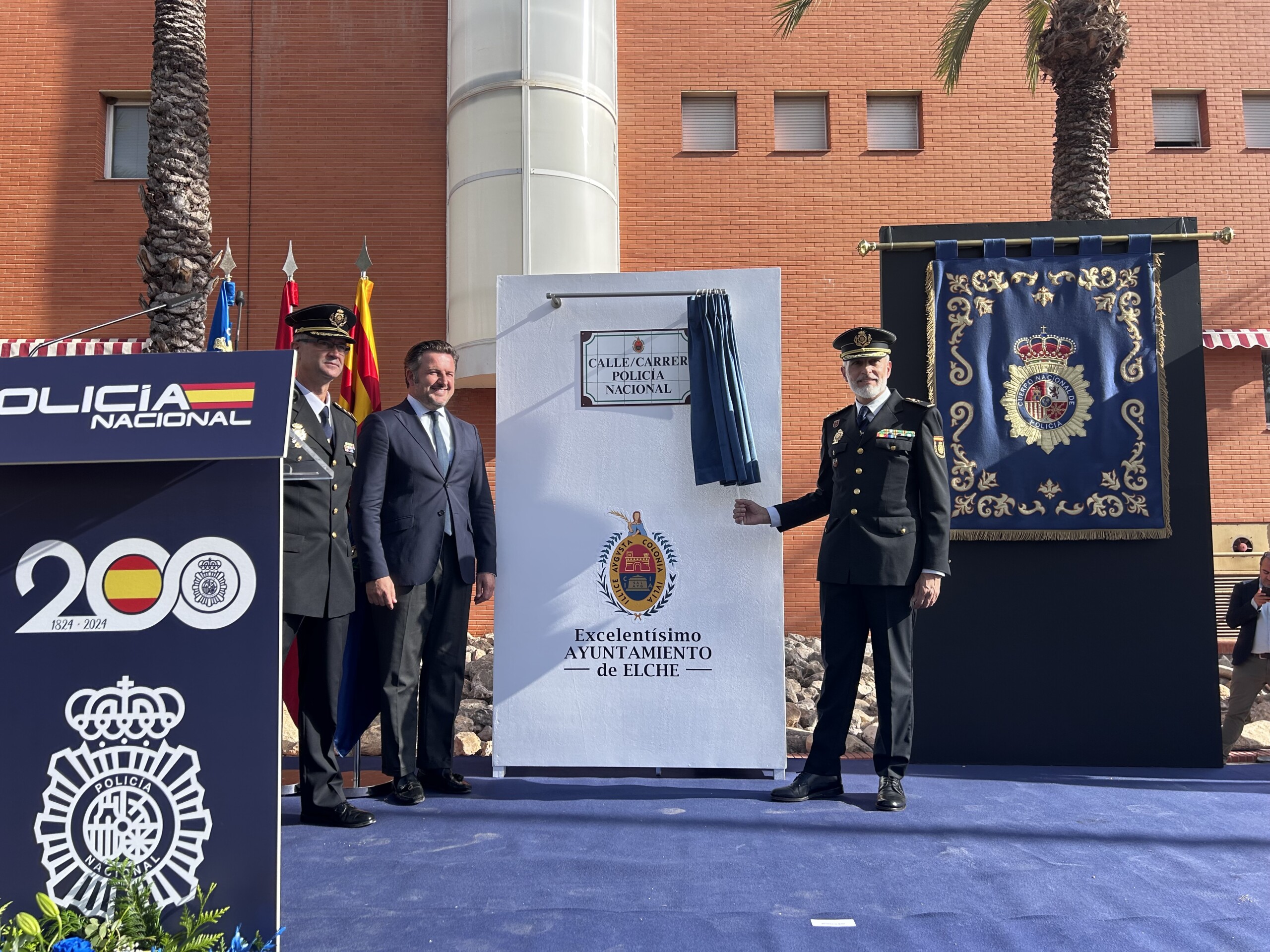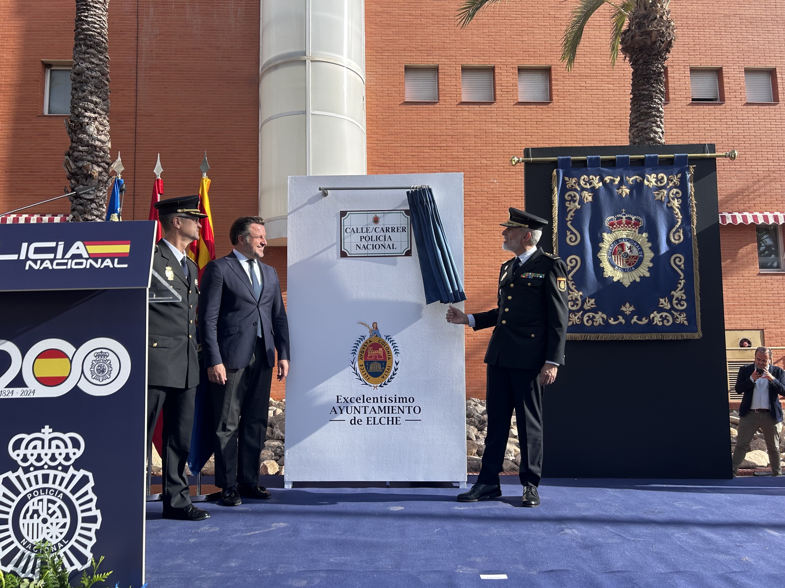 “Este es un acto de reconocimiento, muestra de afecto, agradecimiento sincero y de orgullo por cada uno de los hombres y mujeres que visten el uniforme de Policía Nacional y sirven a Elche. Ahora también y de manera permanente el callejero de Elche os recoge y nos recuerda que la Policía Nacional también es un bien y un patrimonio de los ilicitanos”, ha afirmado el alcalde.