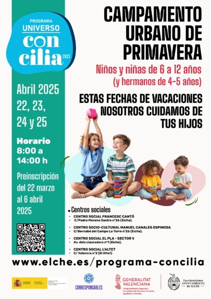 El Ayuntamiento de Elche, a través de la Concejalía de Infancia, Familia y Mayores, ha organizado el Campamento Urbano de Primavera dentro de las iniciativas del programa Universo Concilia con el que se pretende ayudar a la conciliación familiar y laboral.
