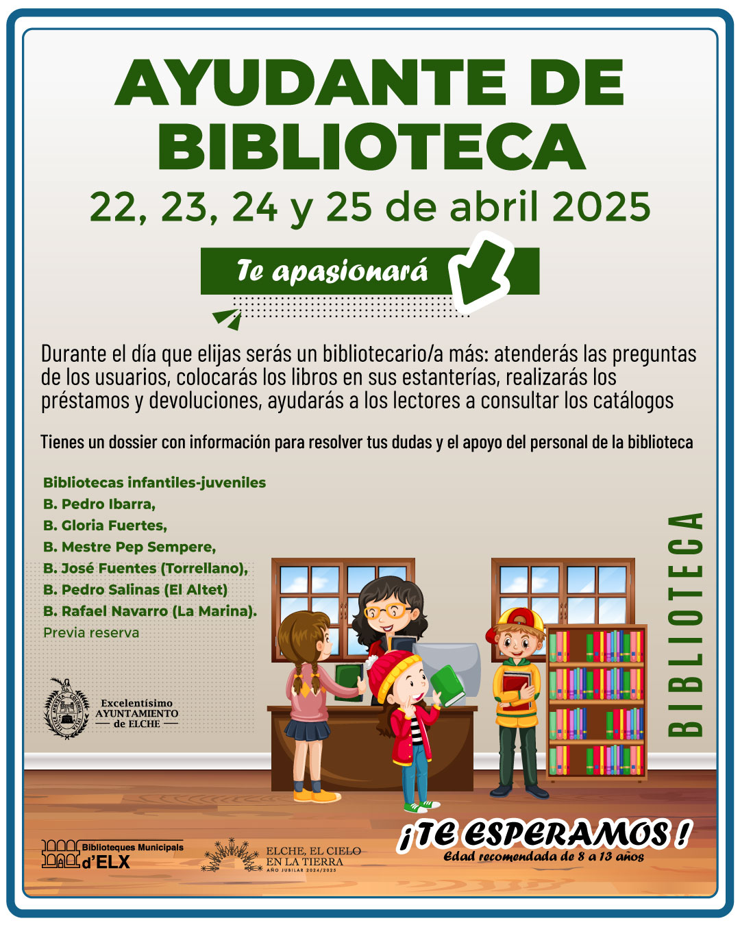¿Quieres ser ayudante de biblioteca? Si tienes entre 8 y 13 años, infórmate en cualquier biblioteca infantil-juvenil de Elche que uses habitualmente o tengas más cerca y reserva un día de los siguientes 22, 23, 24 y 25 de abril.