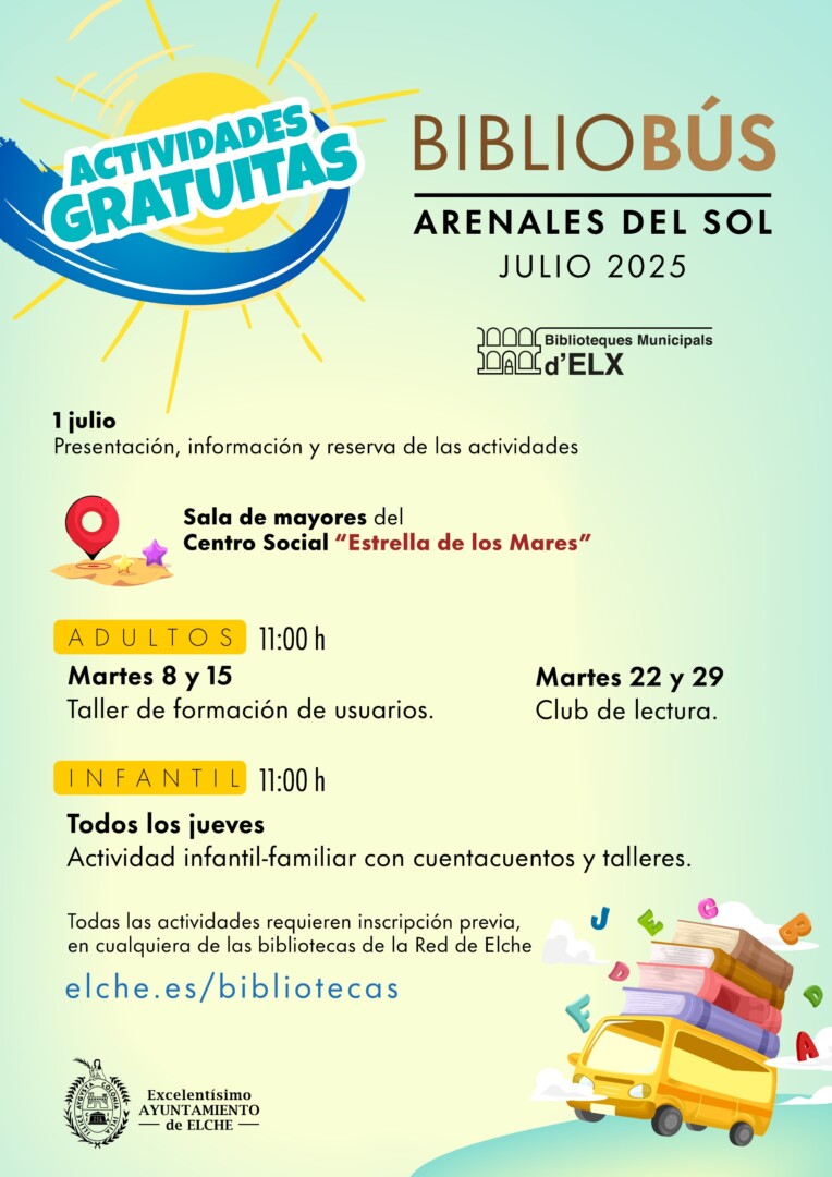 El Ayuntamiento de Elche, a través de la concejalía de Bibliotecas, ha puesto en marcha una nueva programación de actividades relacionadas con la lectura en los servicios bibliotecarios de Arenales del Sol durante el mes de julio.