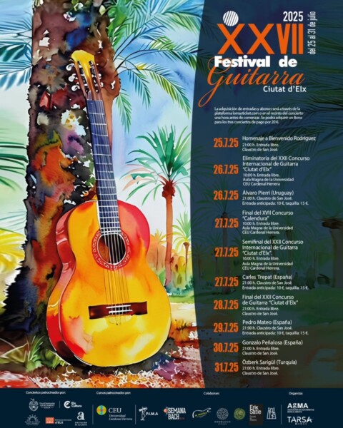 El Patio de los Naranjos de Las Clarisas ha acogido la presentación de la XXVII edición del Festival de Guitarra ‘Ciutat d’Elx’ que tendrá lugar el próximo mes de julio. Un festival que convierte a Elche en el epicentro de la guitarra clásica durante una semana, reuniendo a grandes figuras del panorama internacional y a jóvenes promesas en un ambiente musical y cultural.