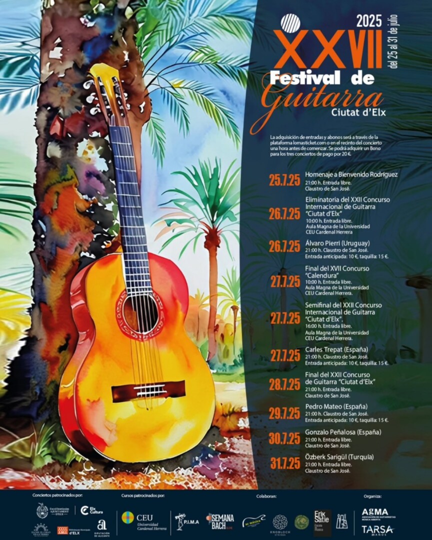 Por su parte, el Concurso de Guitarra ‘Ciutat d’Elx’ tendrá lugar el 27 de julio y el ganador del primer premio recibirá una compensación económica de 1.500 euros más la actuación dentro del XXVII Festival de Guitarra ‘Ciutat d’Elx’ entre otros galardones. Como novedad en esta edición, habrá un premio “Semana de Bach” que se otorgará al mejor intérprete de una obra de Johan Sebastian Bach en cualquier fase del concurso.