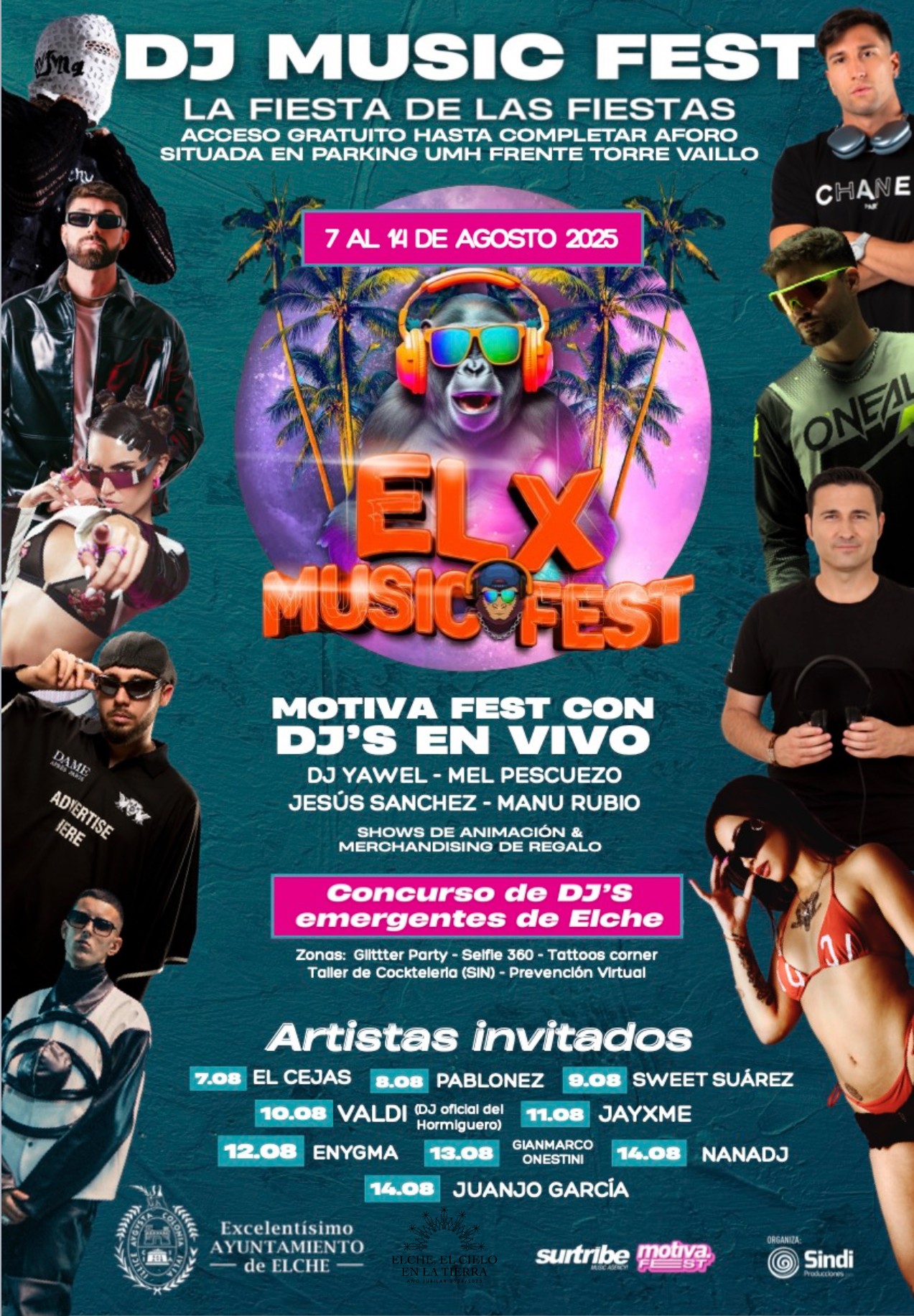 En este sentido, el Elx Music Fest dará comienzo el 7 de agosto con la actuación de DJ Cejas, quien se viralizó hace unos años por redes sociales llegando a millones de personas de todo el país y que ha participado en varias películas de éxito como Padre No Hay Más Que Uno.