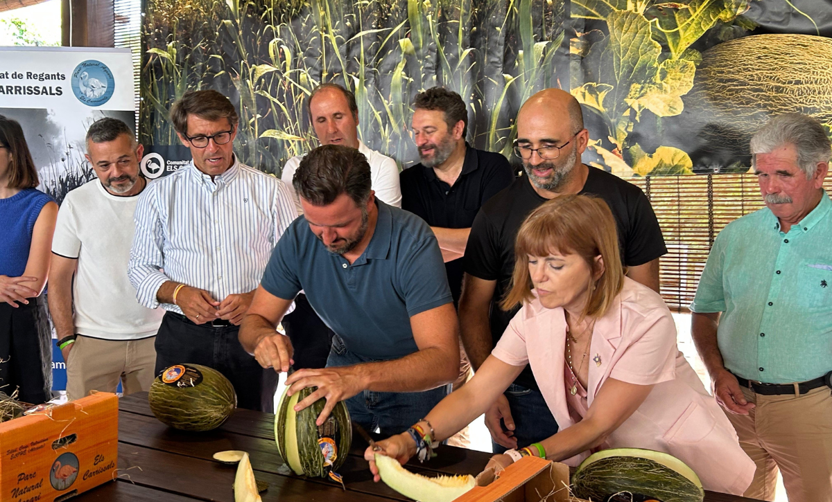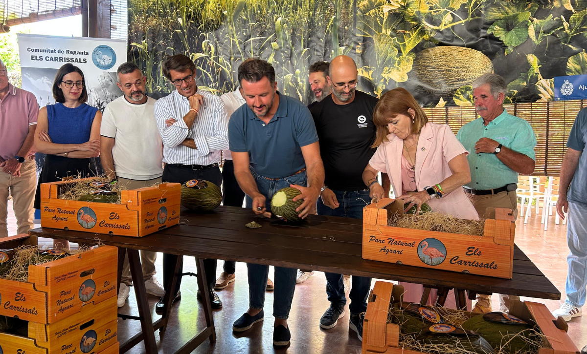 Pablo Ruz y Aurora Rodil han sido los encargados de realizar el tradicional corte simbólico del melón con el que se da inicio a la campaña de la temporada 2025, y lo han hecho junto al padrino de la campaña, Pedro Valero, presidente de ASAJA Elche y el presidente de la Comunidad de Regantes de Carrizales, Fernando Antón.