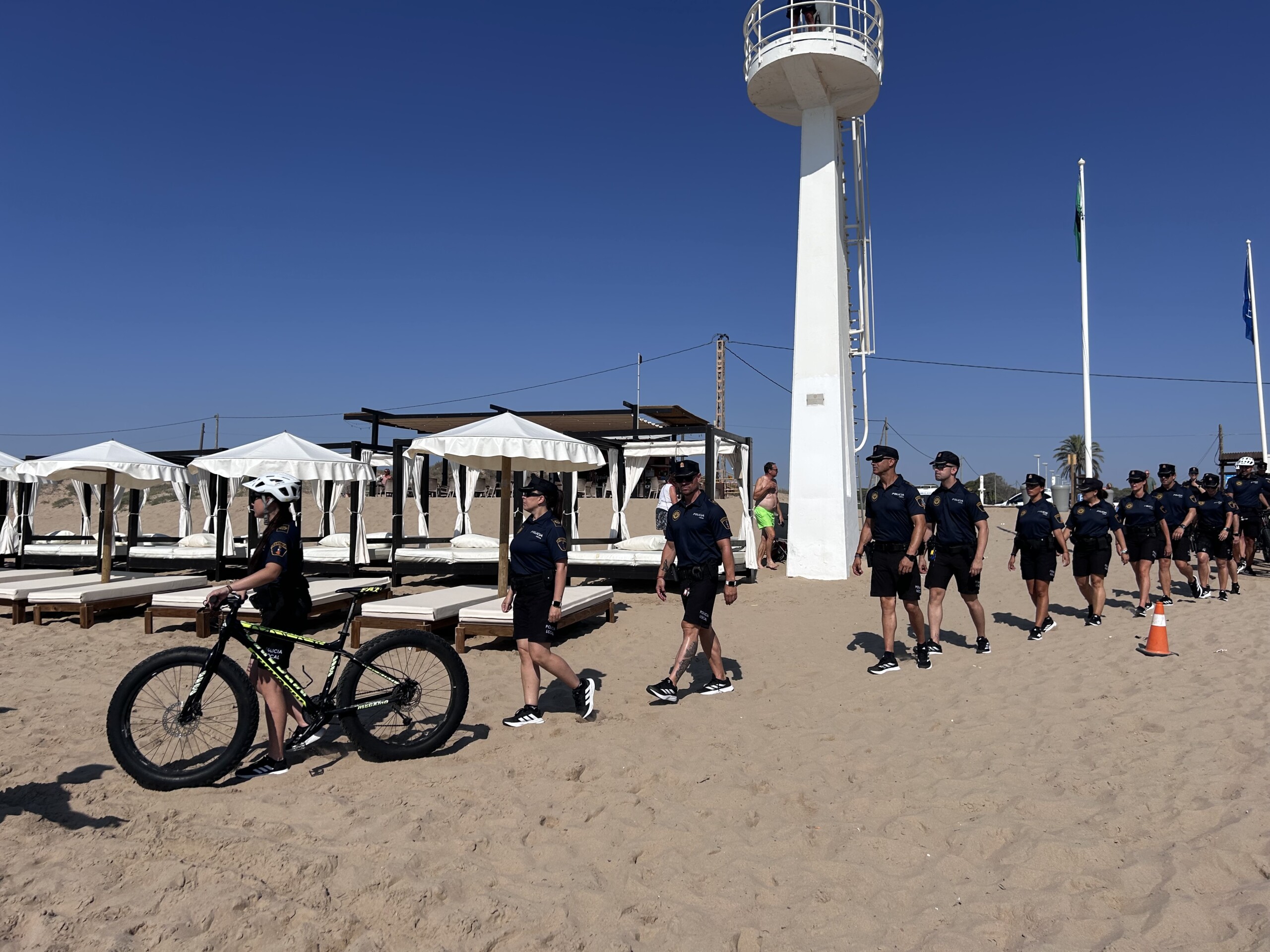 Este dispositivo está formado por la Unidad Marítima y Atención Turística (GRUMAT) que cuenta con 18 agentes, a través de patrullas a pie y en bicicleta por la arena y vigilancia desde la embarcación, pero también aérea por la Unidad Municipal de Apoyo y Emergencias de la Policía Local (UMAE) para evitar masificaciones, realizar rescates marítimos o recabar información sobre el estado de las playas, con 2 pilotos.