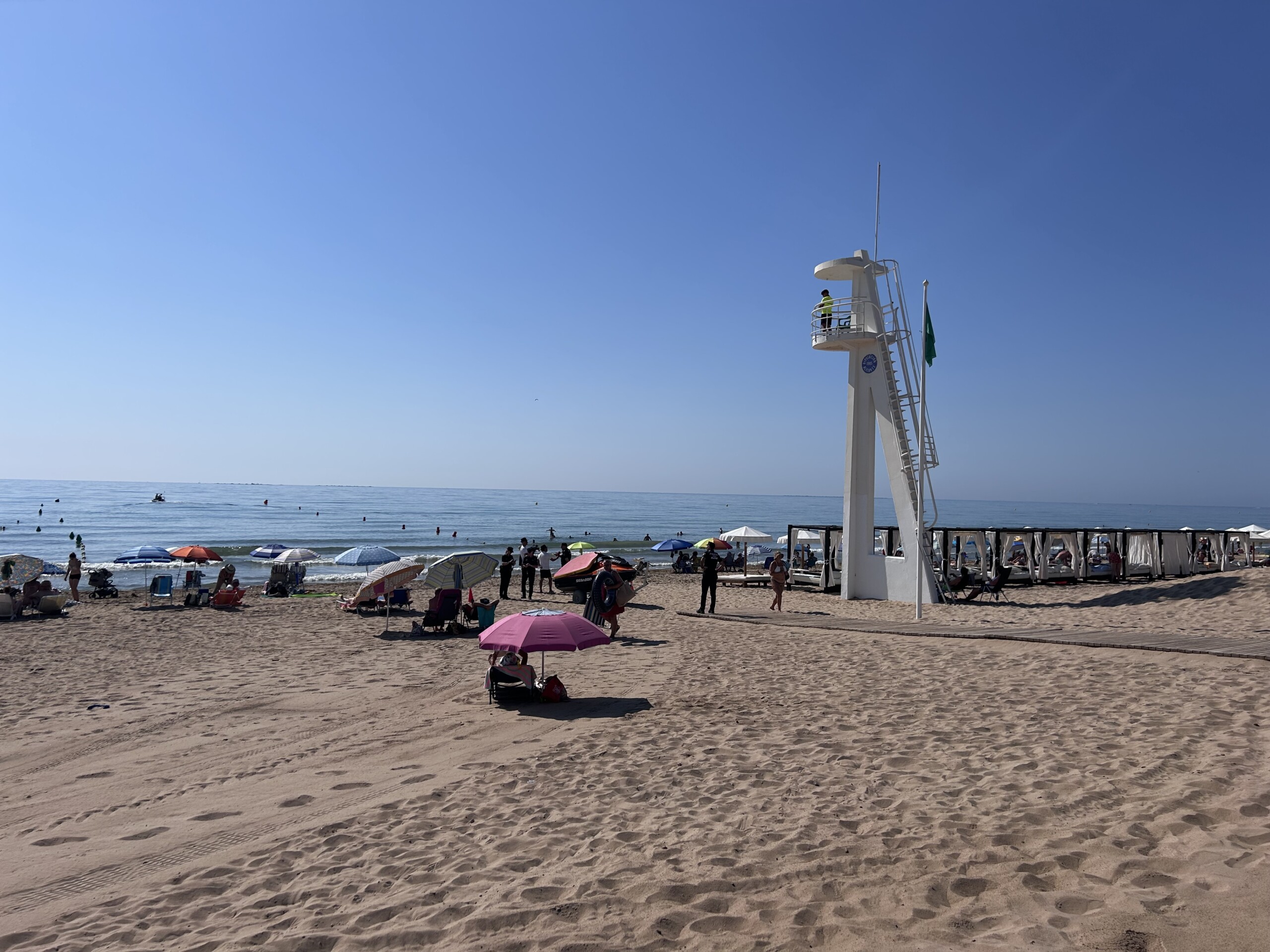 Asimismo, el servicio que se presta desde el pasado 12 de abril y los fines de semana de mayo con 4 puestos de socorro, se incrementó el día 1 de junio con la apertura de los 7 puestos distribuidos por todas las playas hasta septiembre de 10:00 a 19:00 horas en todas las playas, con un equipo formado por coordinadores, socorristas, personal sanitario y motos acuáticas, con un total de 31 personas a su cargo. En julio y agosto, el servicio se amplía el horario de 10:00 a 20:00 horas, para garantizar la seguridad ante la mayor afluencia.