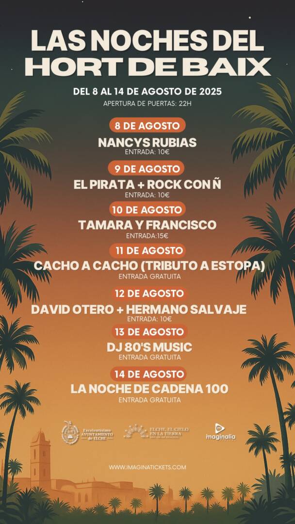 Las Noches del Hort de Baix vuelven del 8 al 14 de agosto con un cartel en el que figuran actuaciones de grupos musicales referentes en el panorama nacional, con motivo de la celebración de las fiestas patronales de Elche.