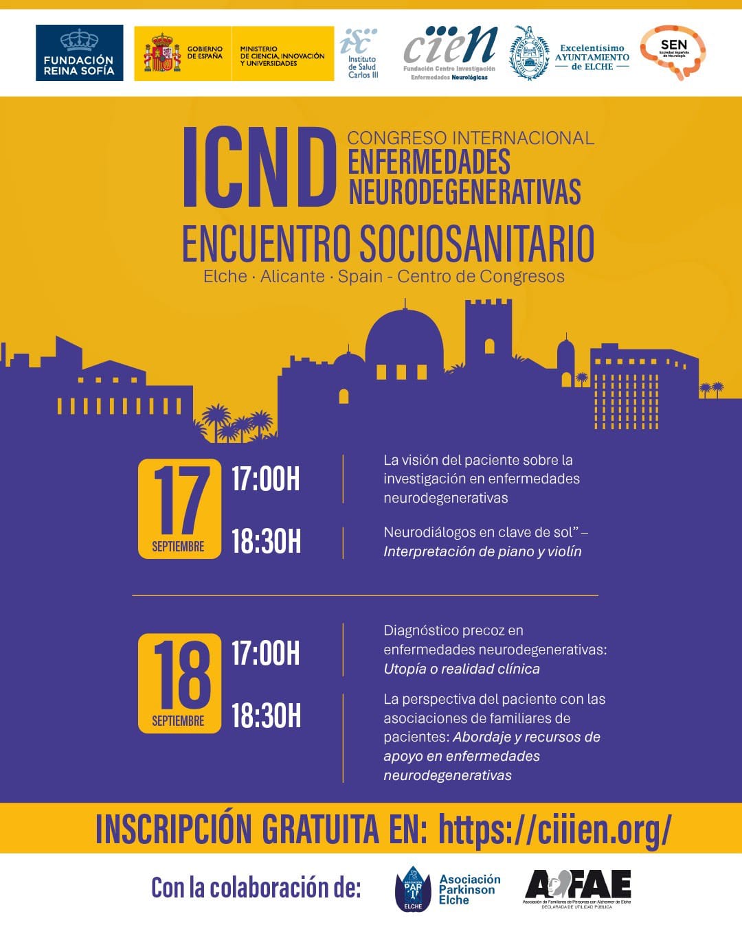 La ciudad de Elche acogerá del 15 al 18 de septiembre el Congreso Internacional de Enfermedades Neurodegenerativas organizado de forma conjunta por la Fundación Reina Sofía, el Centro de Investigación de Enfermedades Neurológicas (CIEN) junto al Ayuntamiento de Elche y la Sociedad Española de Neurología.